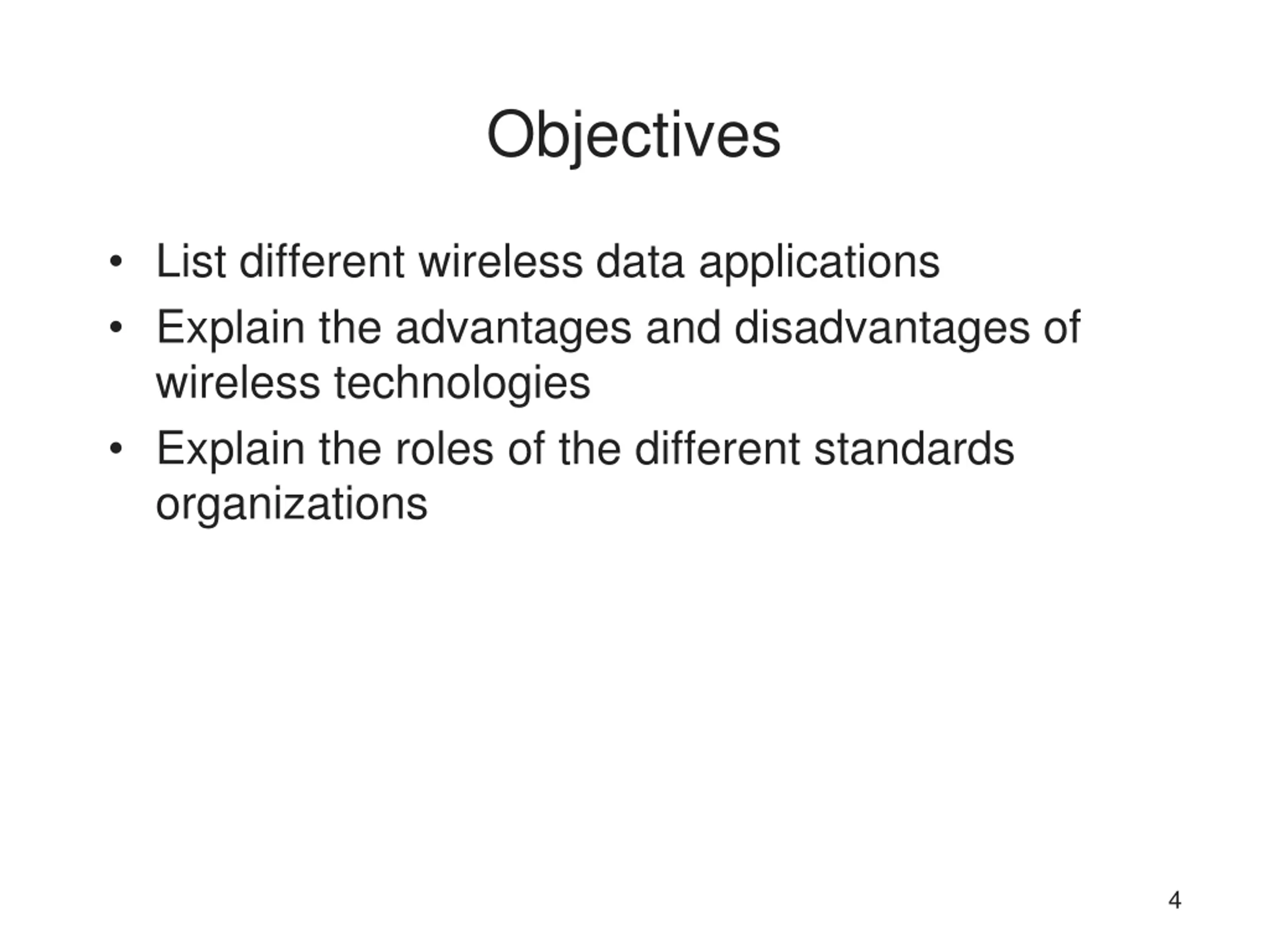 Objectives List different wireless data applications Explain the advantages and disadvantages of wireless technologies Explain the roles of the different standards organizations 4