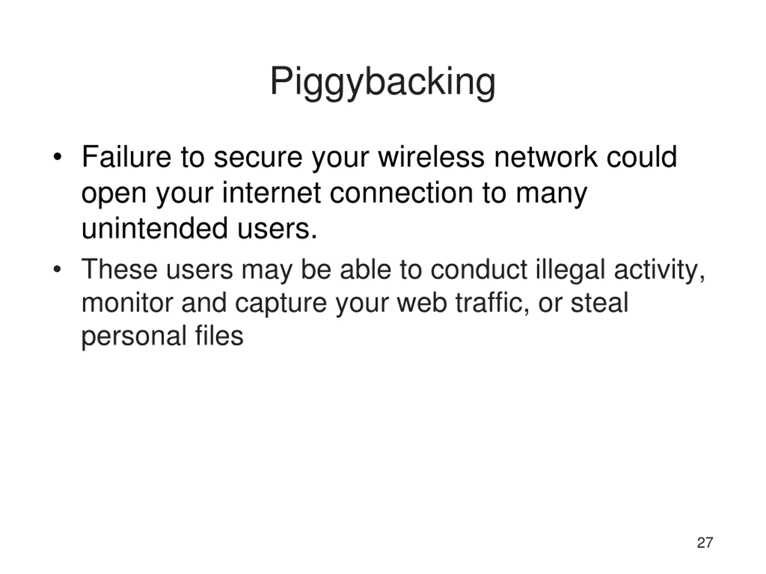 Piggybacking Failure to secure your wireless network could open your internet connection to many unintended users. These users may be able to conduct illegal activity, monitor and capture your web traffic, or steal personal files 27