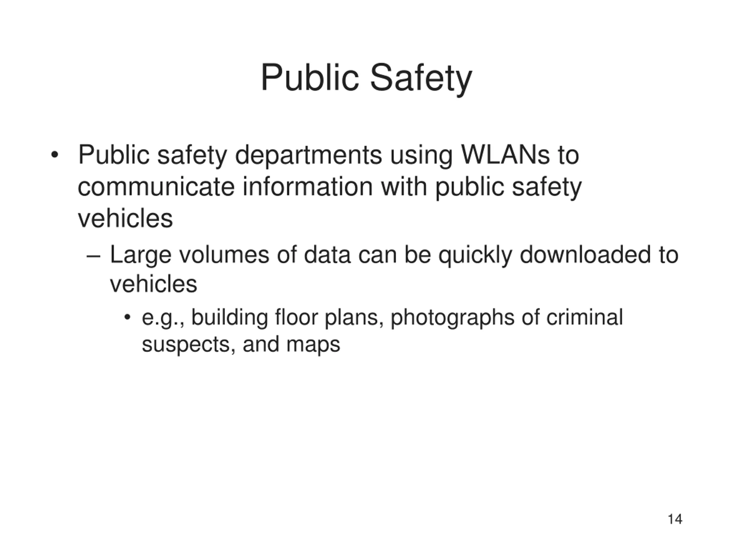 Public Safety Public safety departments using WLANs to communicate information with public safety vehicles Large volumes of data can be quickly downloaded to vehicles e.g., building floor plans, photographs of criminal suspects, and maps 14