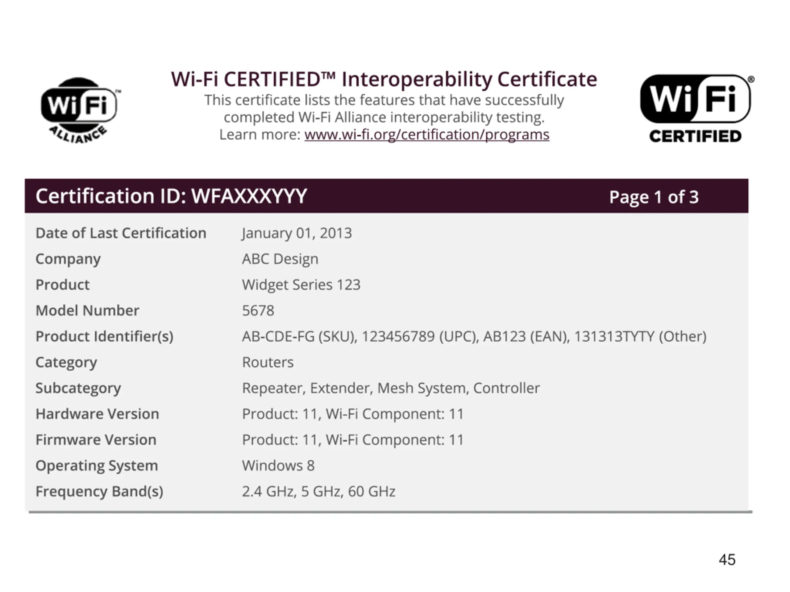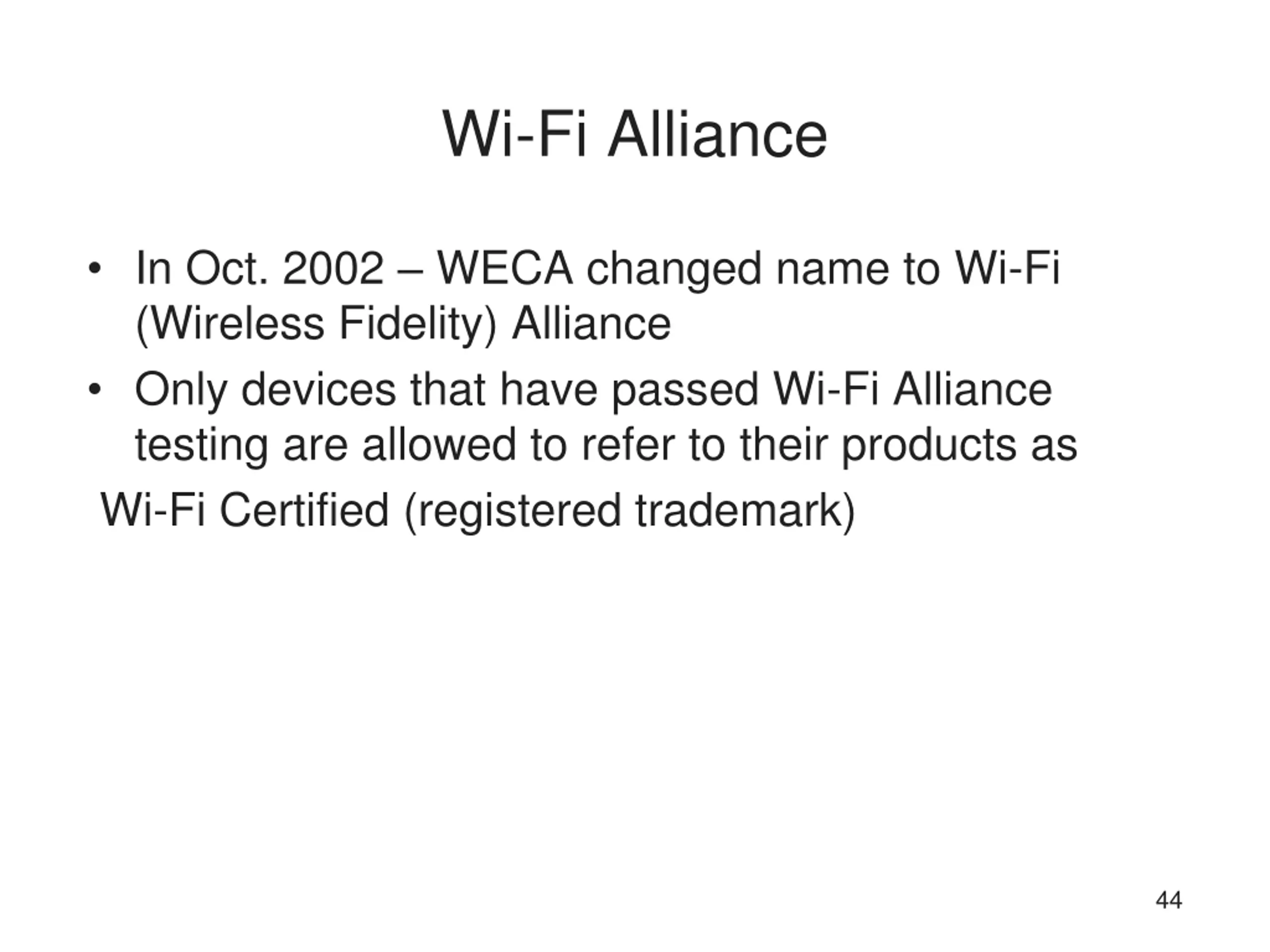 Wi-Fi Alliance In Oct. 2002 WECA changed name to Wi-Fi (Wireless Fidelity) Alliance Only devices that have passed Wi-Fi Alliance testing are allowed to refer to their products as Wi-Fi Certified (registered trademark) 44