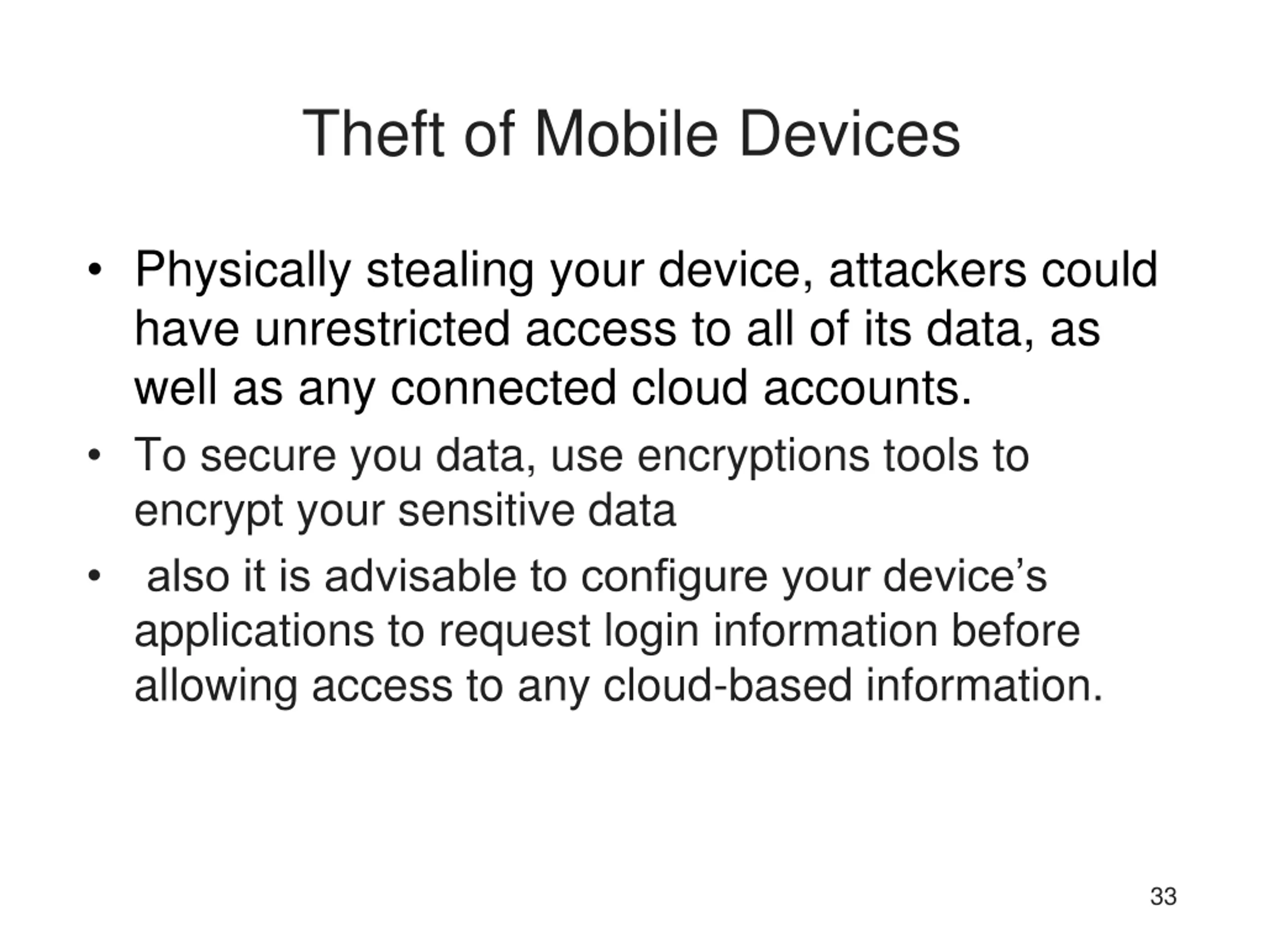 Theft of Mobile Devices Physically stealing your device, attackers could have unrestricted access to all of its data, as well as any connected cloud accounts. To secure you data, use encryptions tools to encrypt your sensitive data also it is advisable to configure your device s applications to request login information before allowing access to any cloud-based information. 33