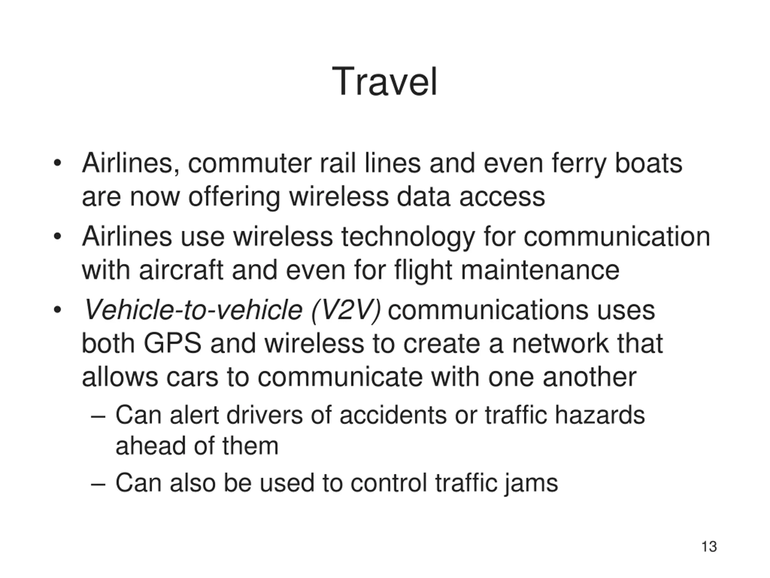 Travel Airlines, commuter rail lines and even ferry boats are now offering wireless data access Airlines use wireless technology for communication with aircraft and even for flight maintenance Vehicle-to-vehicle (V2V) communications uses both GPS and wireless to create a network that allows cars to communicate with one another Can alert drivers of accidents or traffic hazards ahead of them Can also be used to control traffic jams 13