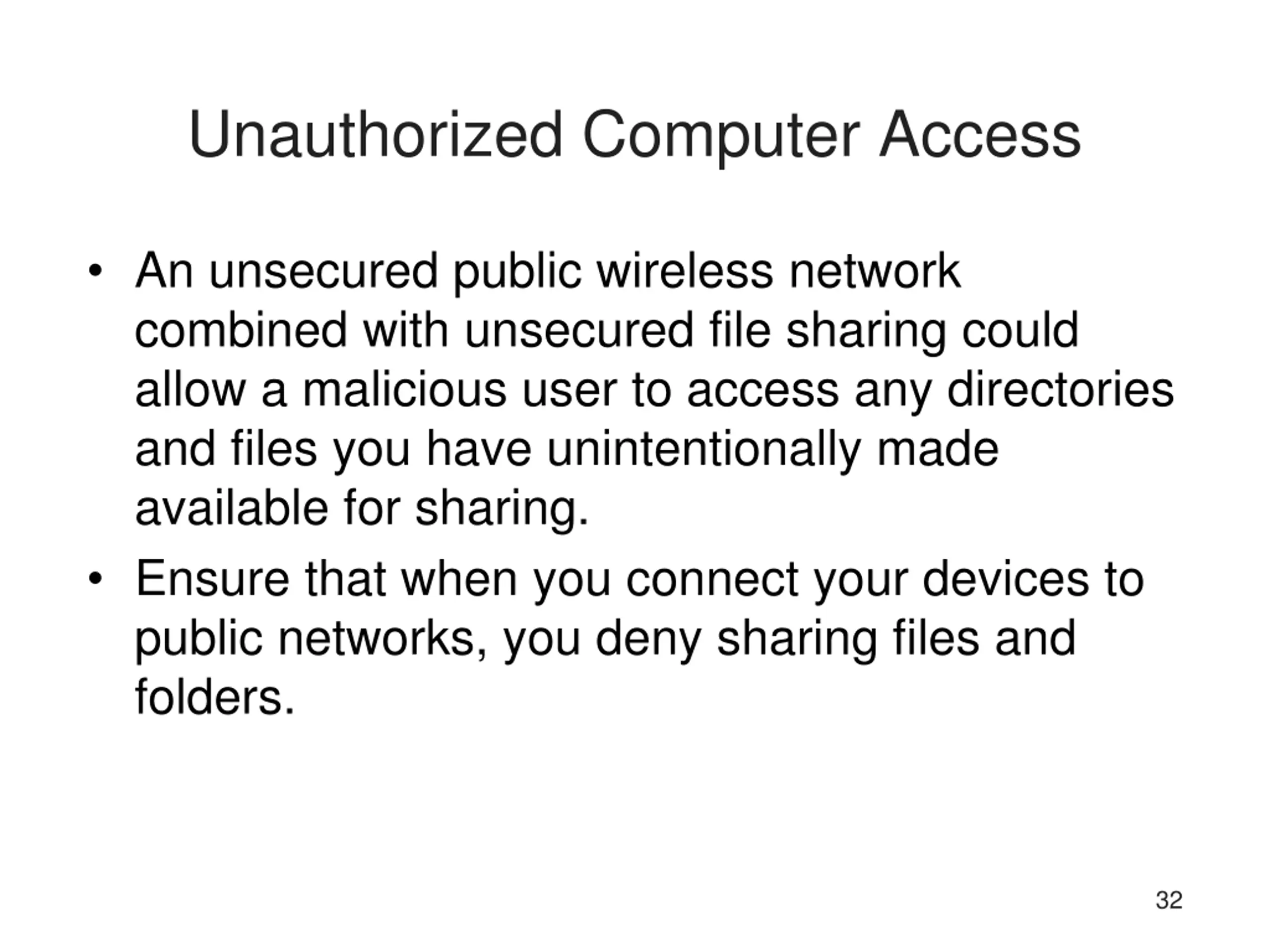 Unauthorized Computer Access An unsecured public wireless network combined with unsecured file sharing could allow a malicious user to access any directories and files you have unintentionally made available for sharing. Ensure that when you connect your devices to public networks, you deny sharing files and folders. 32