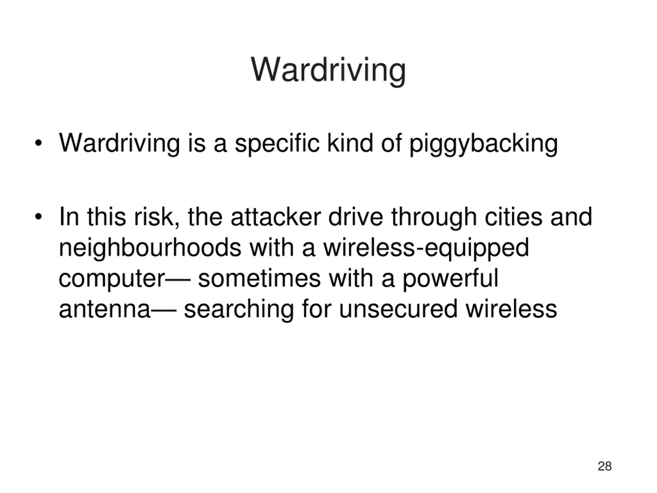 Wardriving Wardriving is a specific kind of piggybacking In this risk, the attacker drive through cities and neighbourhoods with a wireless-equipped computer sometimes with a powerful antenna searching for unsecured wireless 28