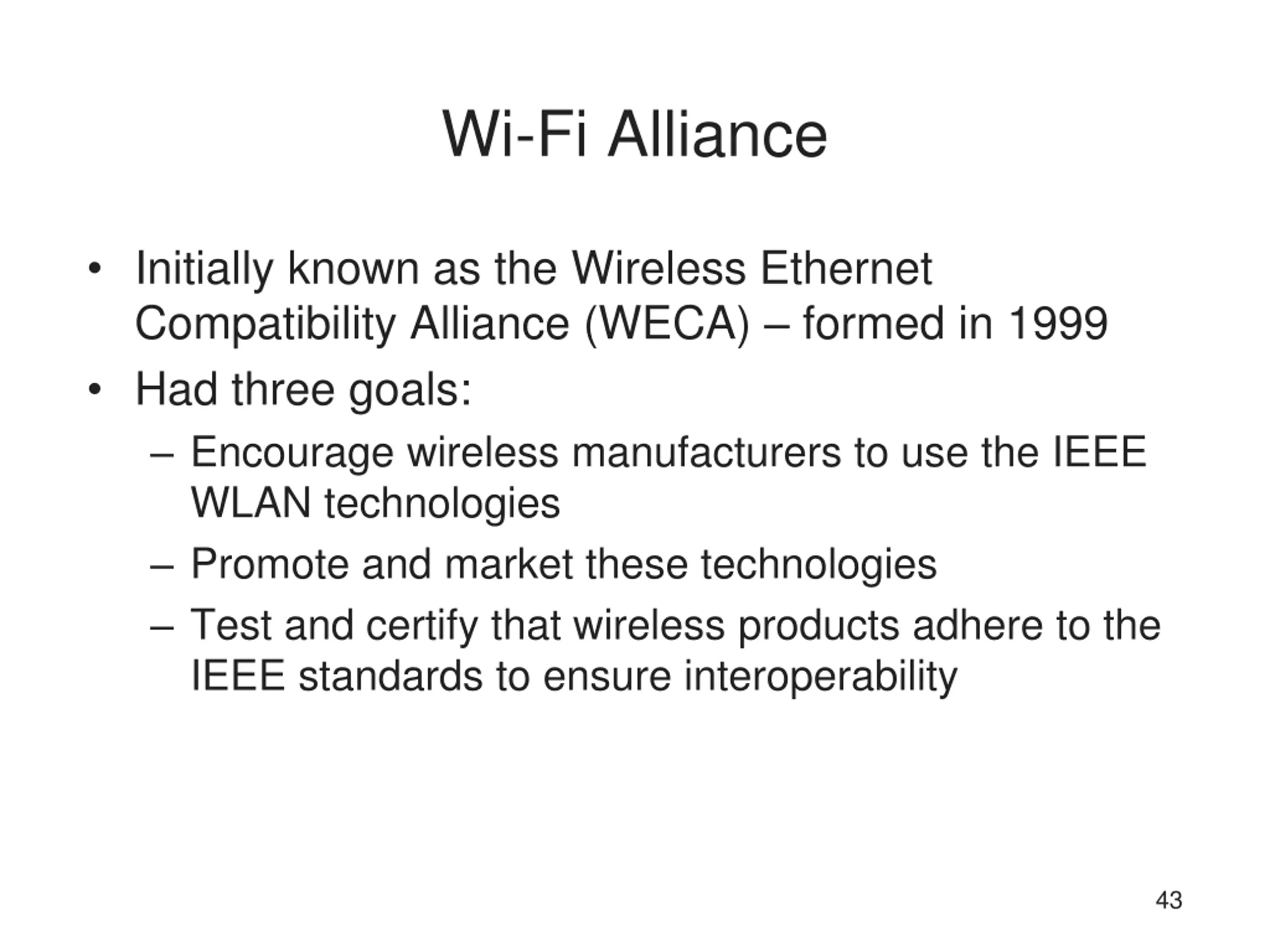 Wi-Fi Alliance Initially known as the Wireless Ethernet Compatibility Alliance (WECA) formed in 1999 Had three goals: Encourage wireless manufacturers to use the IEEE WLAN technologies Promote and market these technologies Test and certify that wireless products adhere to the IEEE standards to ensure interoperability 43