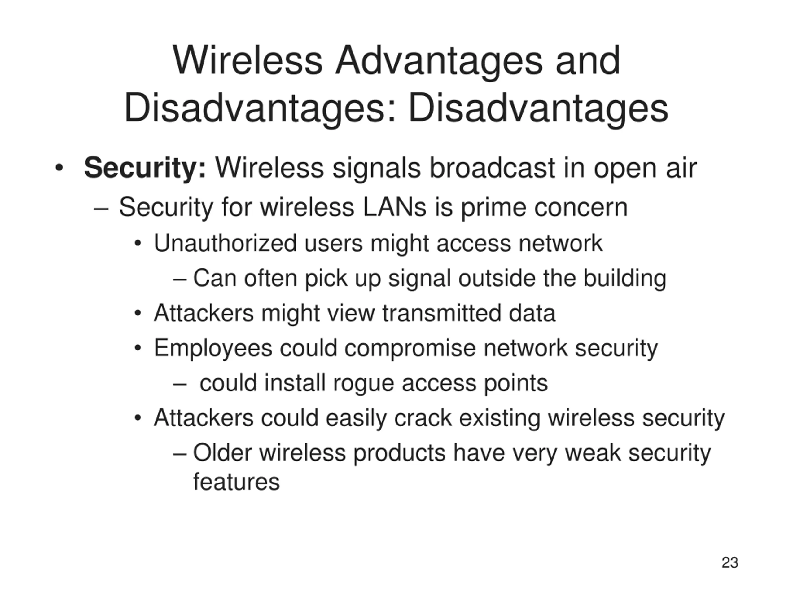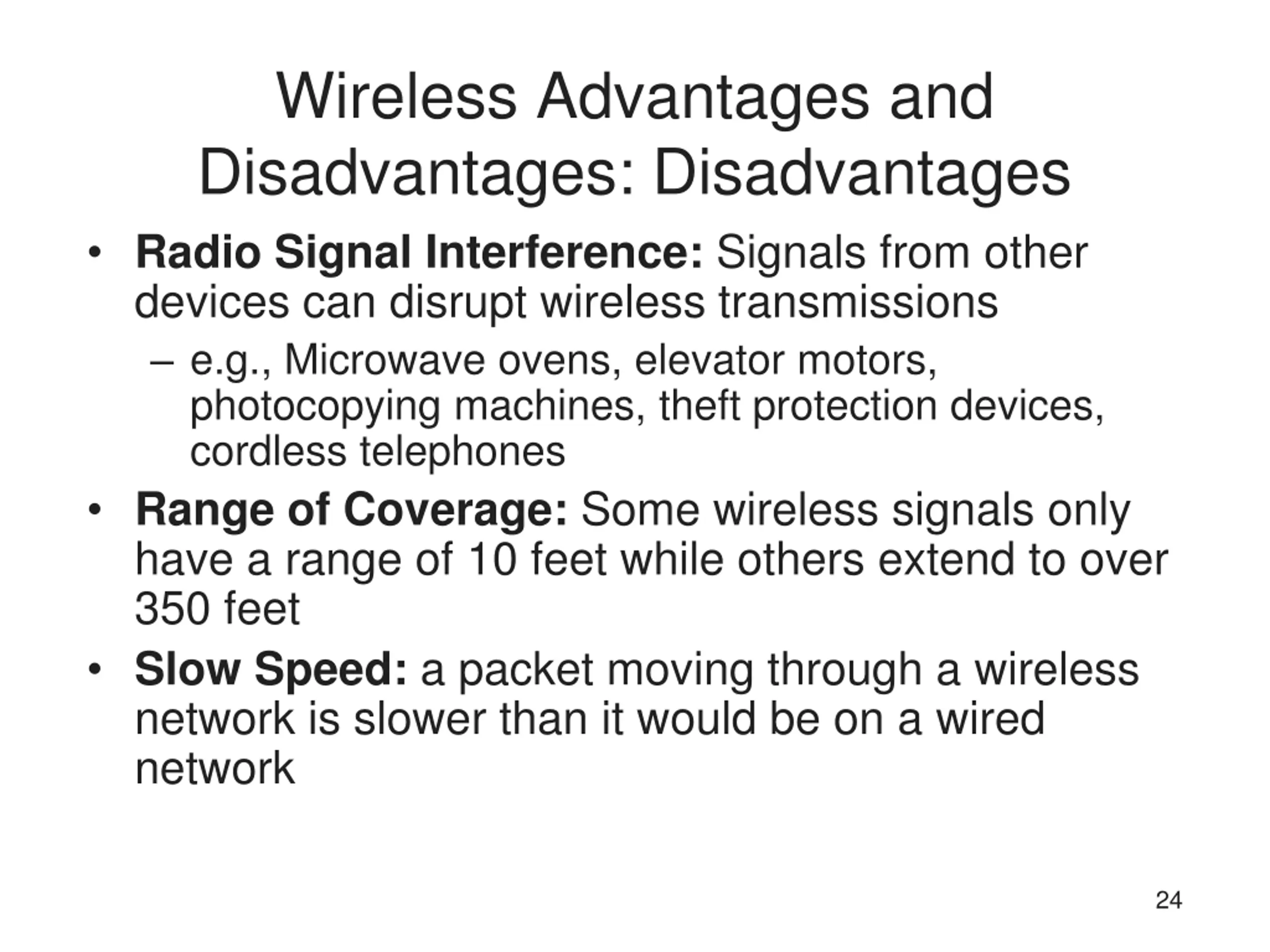 Wireless Advantages and Disadvantages: Disadvantages Security: Wireless signals broadcast in open air Security for wireless LANs is prime concern Unauthorized users might access network Can often pick up signal outside the building Attackers might view transmitted data Employees could compromise network security could install rogue access points Attackers could easily crack existing wireless security Older wireless products have very weak security features 23