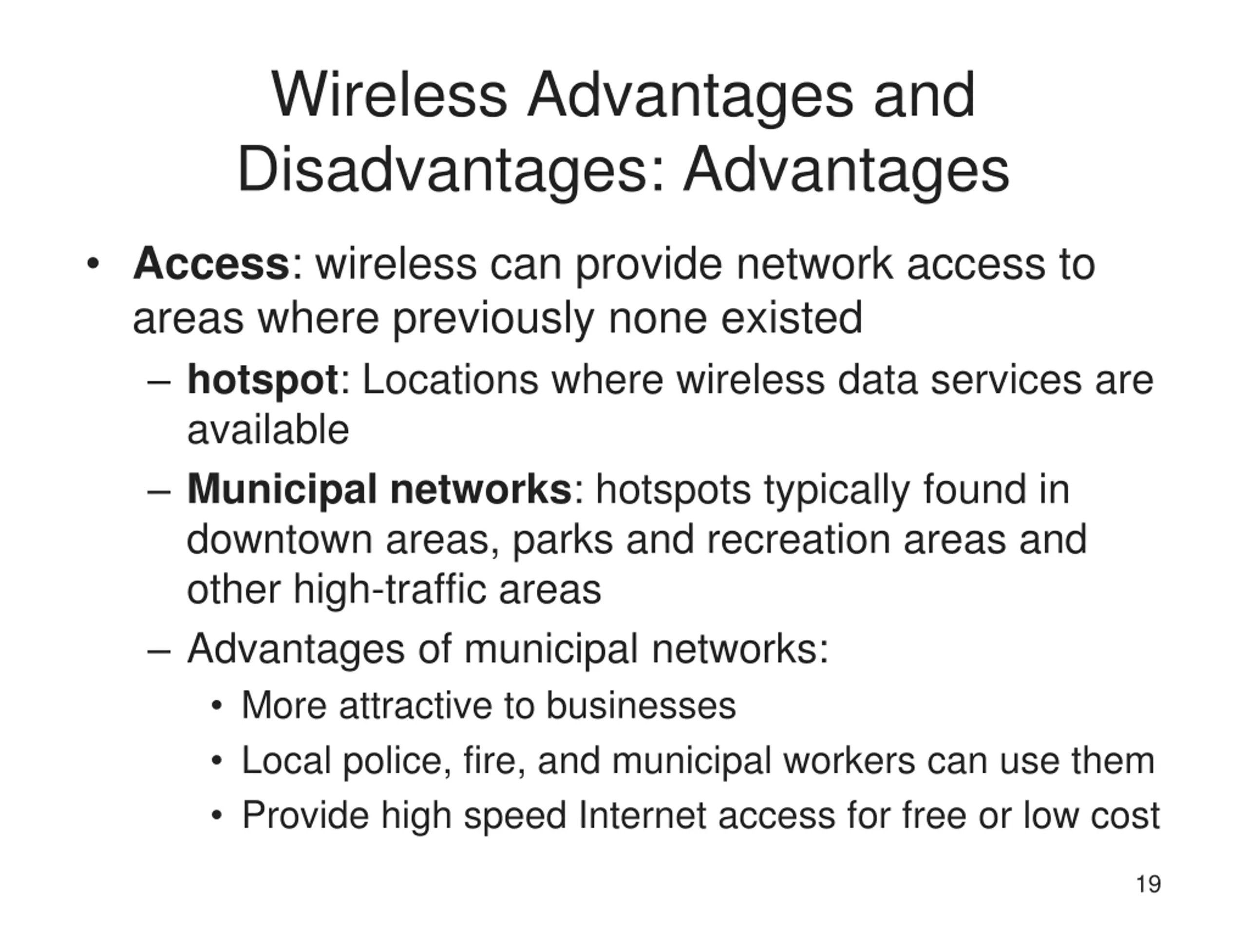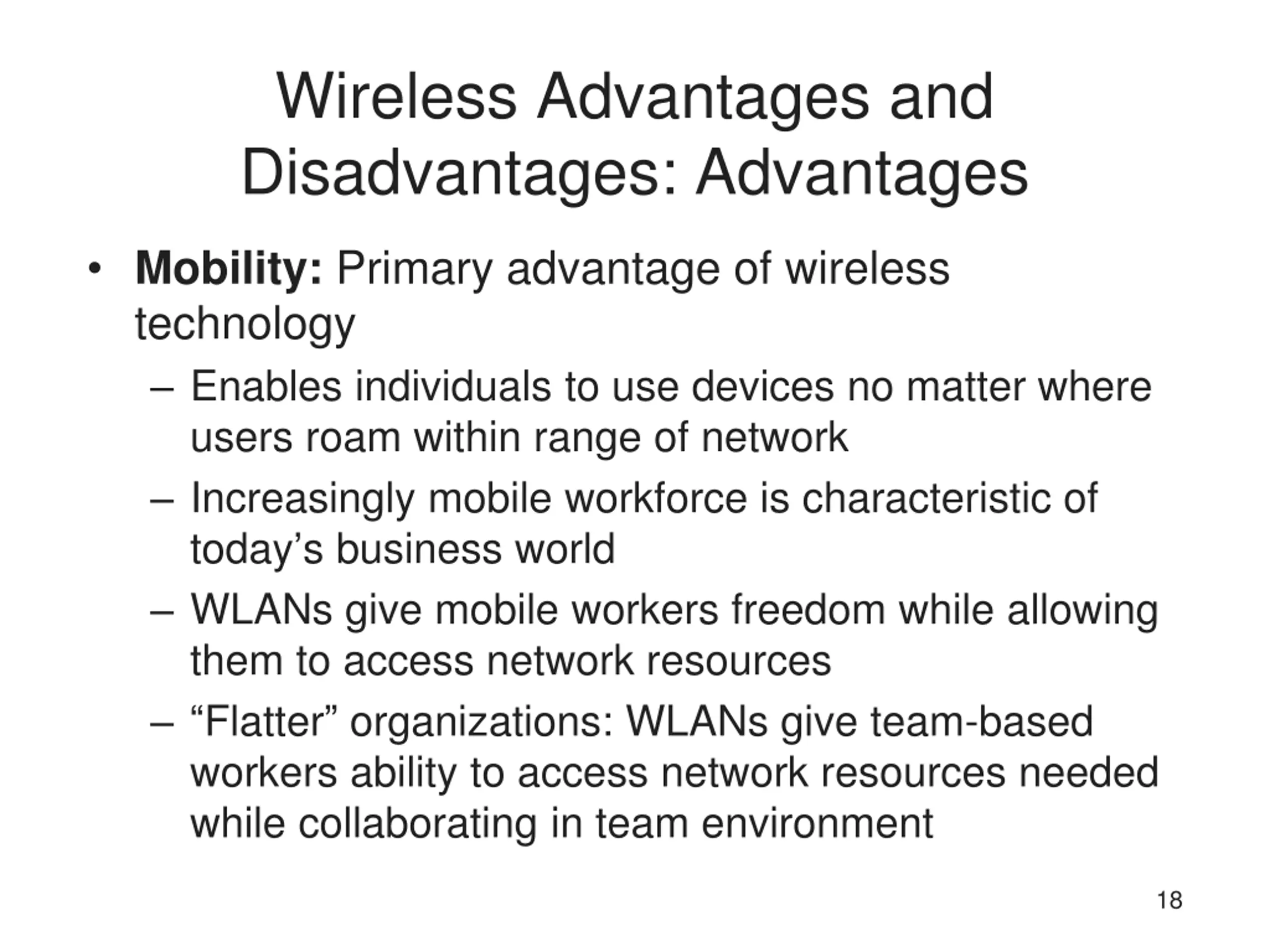 Wireless Advantages and Disadvantages: Advantages Mobility: Primary advantage of wireless technology Enables individuals to use devices no matter where users roam within range of network Increasingly mobile workforce is characteristic of today s business world WLANs give mobile workers freedom while allowing them to access network resources Flatter organizations: WLANs give team-based workers ability to access network resources needed while collaborating in team environment 18