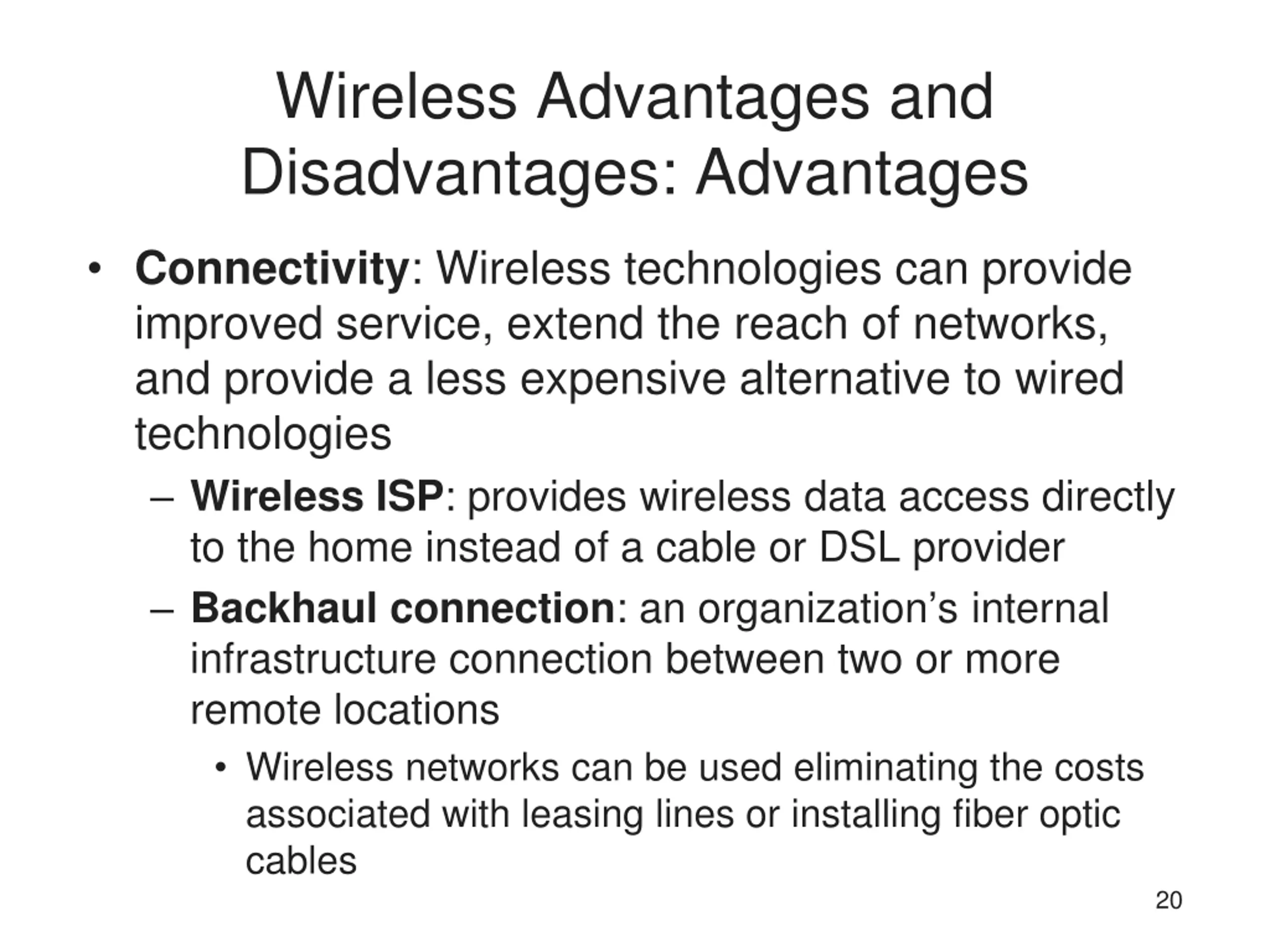 Wireless Advantages and Disadvantages: Advantages Connectivity: Wireless technologies can provide improved service, extend the reach of networks, and provide a less expensive alternative to wired technologies Wireless ISP: provides wireless data access directly to the home instead of a cable or DSL provider Backhaul connection: an organization s internal infrastructure connection between two or more remote locations Wireless networks can be used eliminating the costs associated with leasing lines or installing fiber optic cables 20