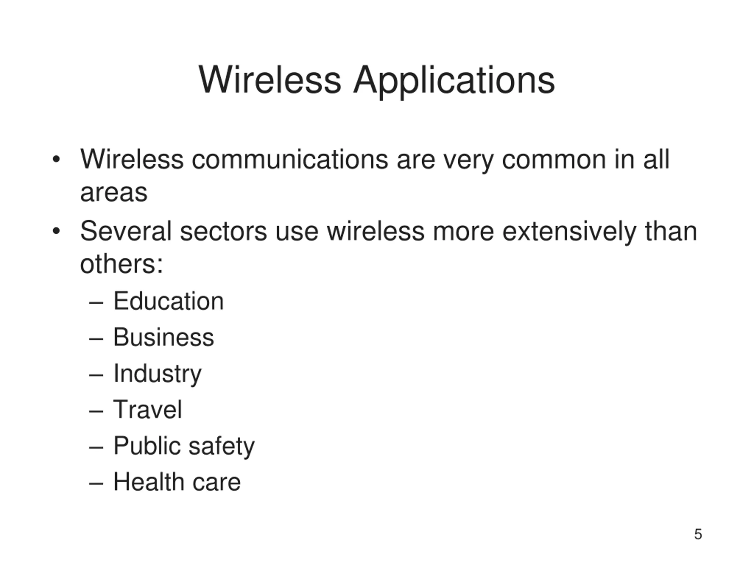 Wireless Applications Wireless communications are very common in all areas Several sectors use wireless more extensively than others: Education Business Industry Travel Public safety Health care 5