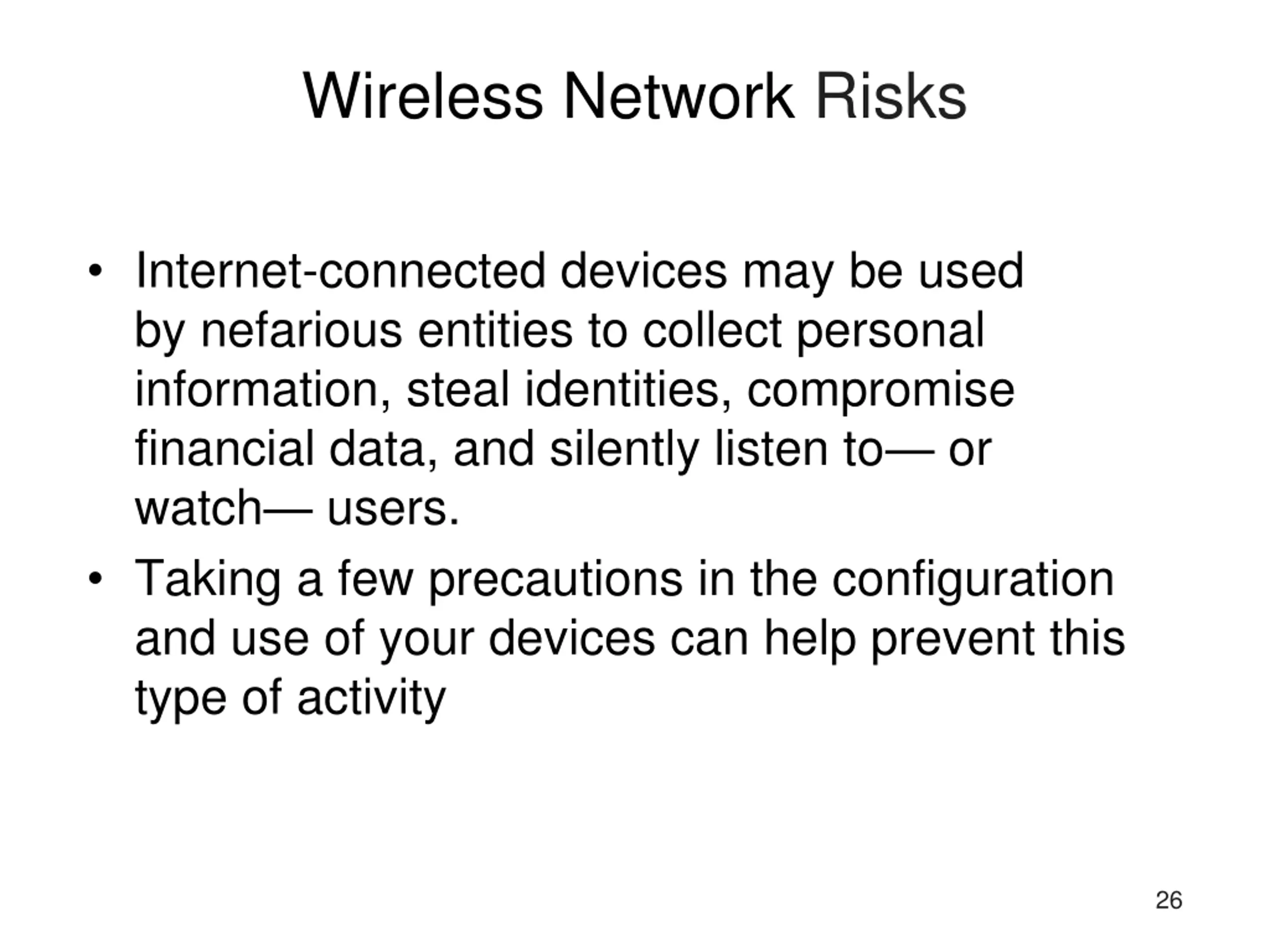 Wireless Network Risks Internet-connected devices may be used by nefarious entities to collect personal information, steal identities, compromise financial data, and silently listen to or watch users. Taking a few precautions in the configuration and use of your devices can help prevent this type of activity 26
