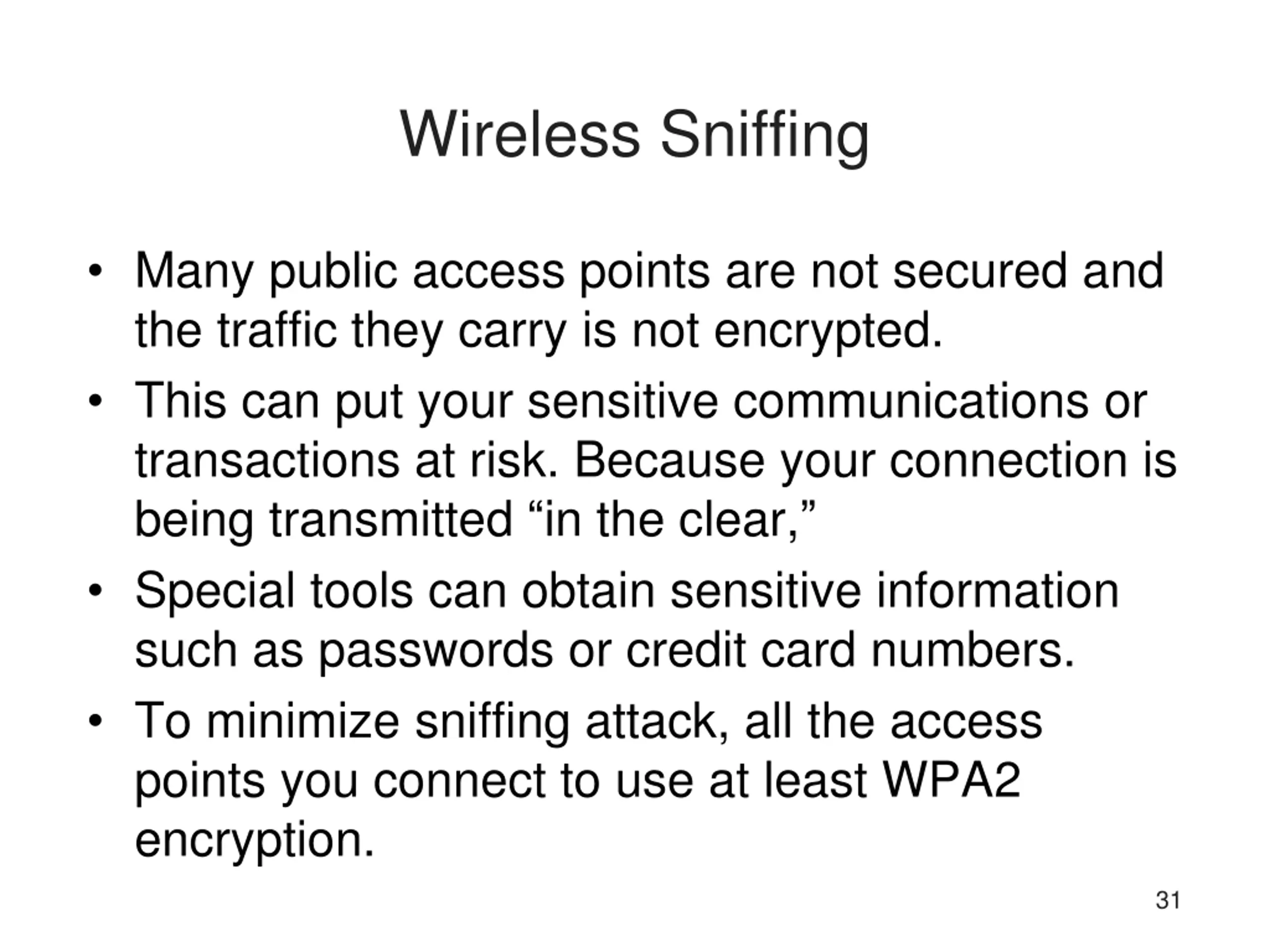 Wireless Sniffing Many public access points are not secured and the traffic they carry is not encrypted. This can put your sensitive communications or transactions at risk. Because your connection is being transmitted in the clear, Special tools can obtain sensitive information such as passwords or credit card numbers. To minimize sniffing attack, all the access points you connect to use at least WPA2 encryption. 31