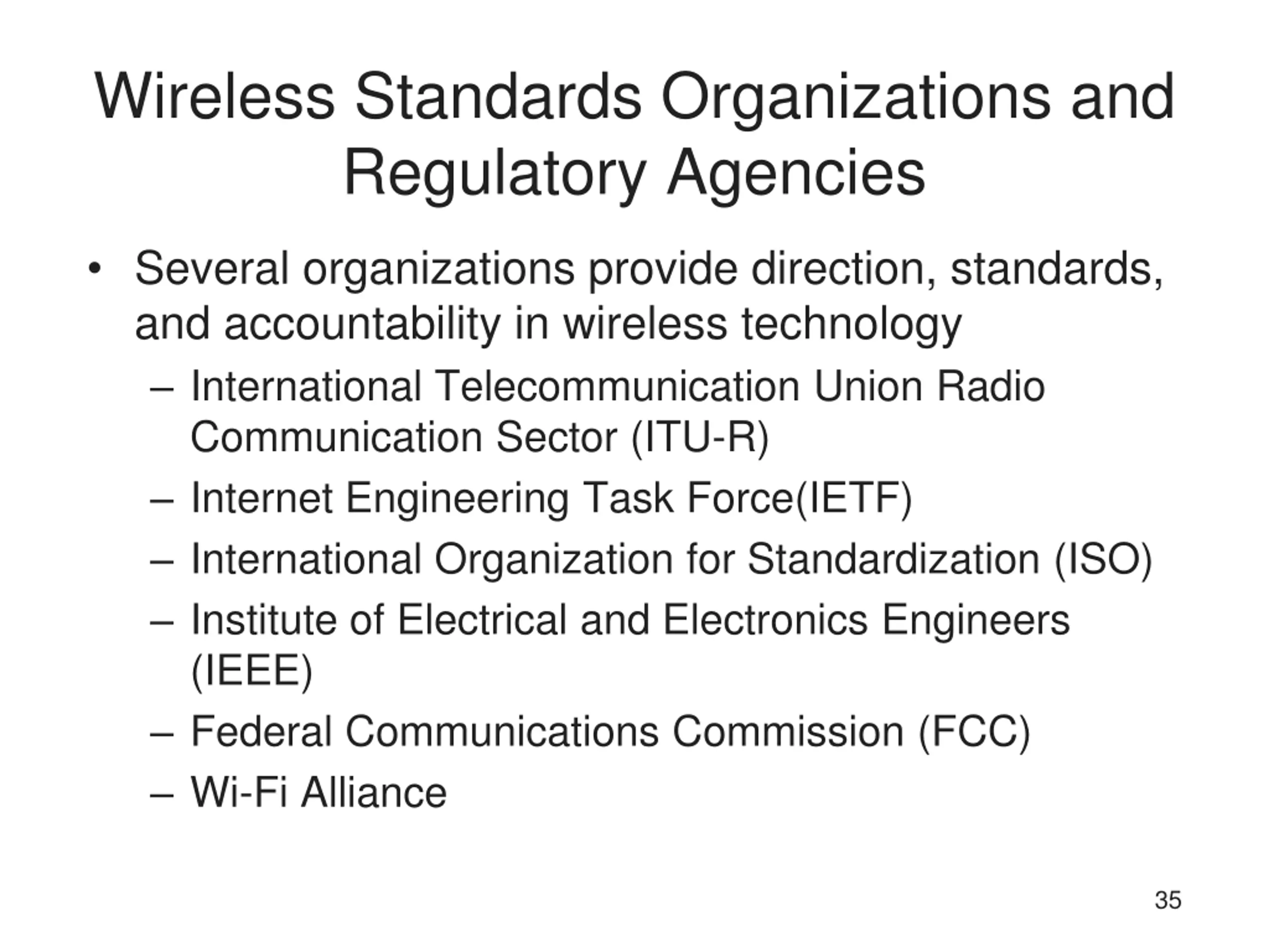 Wireless Standards Organizations and Regulatory Agencies Several organizations provide direction, standards, and accountability in wireless technology International Telecommunication Union Radio Communication Sector (ITU-R) Internet Engineering Task Force(IETF) International Organization for Standardization (ISO) Institute of Electrical and Electronics Engineers (IEEE) Federal Communications Commission (FCC) Wi-Fi Alliance 35