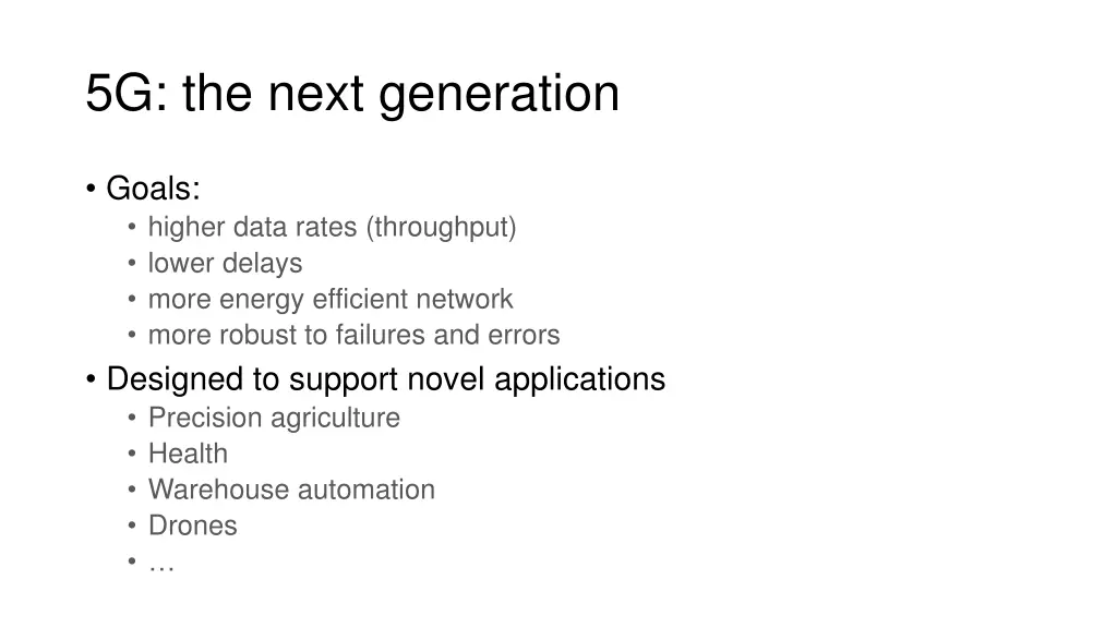 5G: the next generation Goals: higher data rates (throughput) lower delays more energy efficient network more robust to failures and errors Designed to support novel applications Precision agriculture Health Warehouse automation Drones