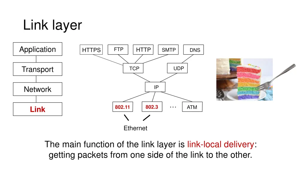 Link layer Application FTP HTTP HTTPS SMTP DNS Transport UDP TCP IP Network 802.3 802.11 ATM Link Ethernet The main function of the link layer is link-local delivery: getting packets from one side of the link to the other.