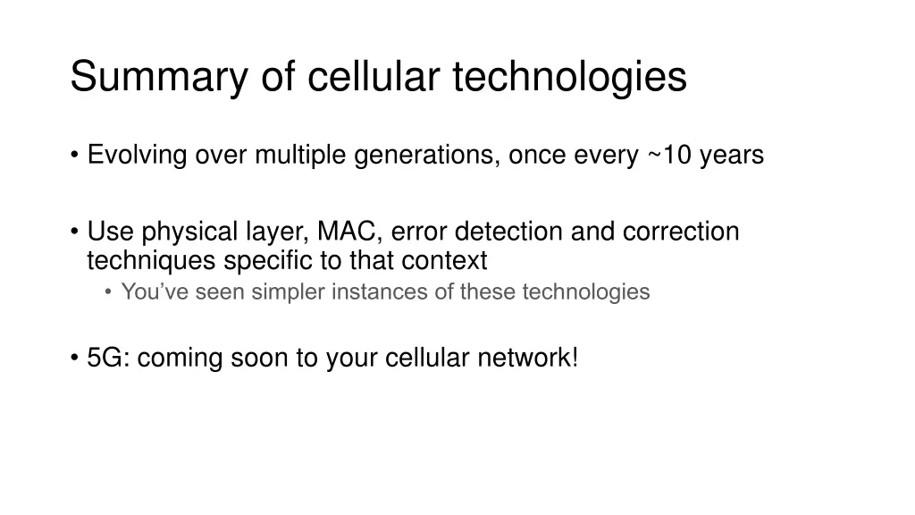 Summary of cellular technologies Evolving over multiple generations, once every ~10 years Use physical layer, MAC, error detection and correction techniques specific to that context You ve seen simpler instances of these technologies 5G: coming soon to your cellular network!