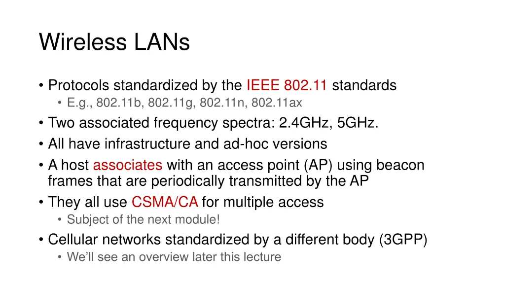 Wireless LANs Protocols standardized by the IEEE 802.11 standards E.g., 802.11b, 802.11g, 802.11n, 802.11ax Two associated frequency spectra: 2.4GHz, 5GHz. All have infrastructure and ad-hoc versions A host associates with an access point (AP) using beacon frames that are periodically transmitted by the AP They all use CSMA/CA for multiple access Subject of the next module! Cellular networks standardized by a different body (3GPP) We ll see an overview later this lecture