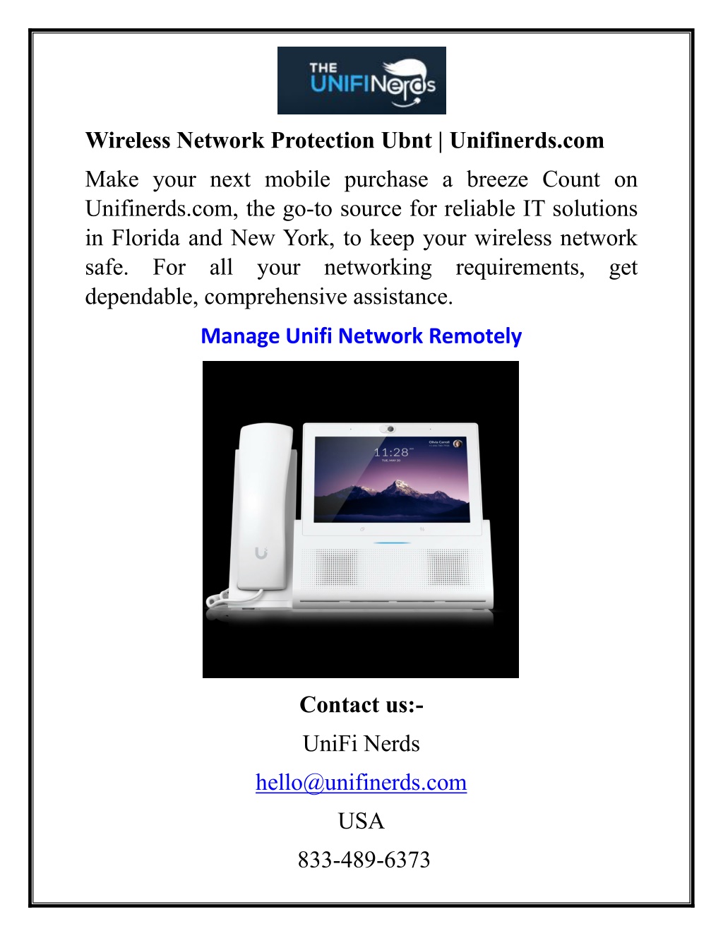 Wireless Network Protection Ubnt | Unifinerds.com Make your next mobile purchase a breeze Count on Unifinerds.com, the go-to source for reliable IT solutions in Florida and New York, to keep your wireless network safe. For all your networking dependable, comprehensive assistance. requirements, get Manage Unifi Network Remotely Contact us:- UniFi Nerds hello@unifinerds.com USA 833-489-6373