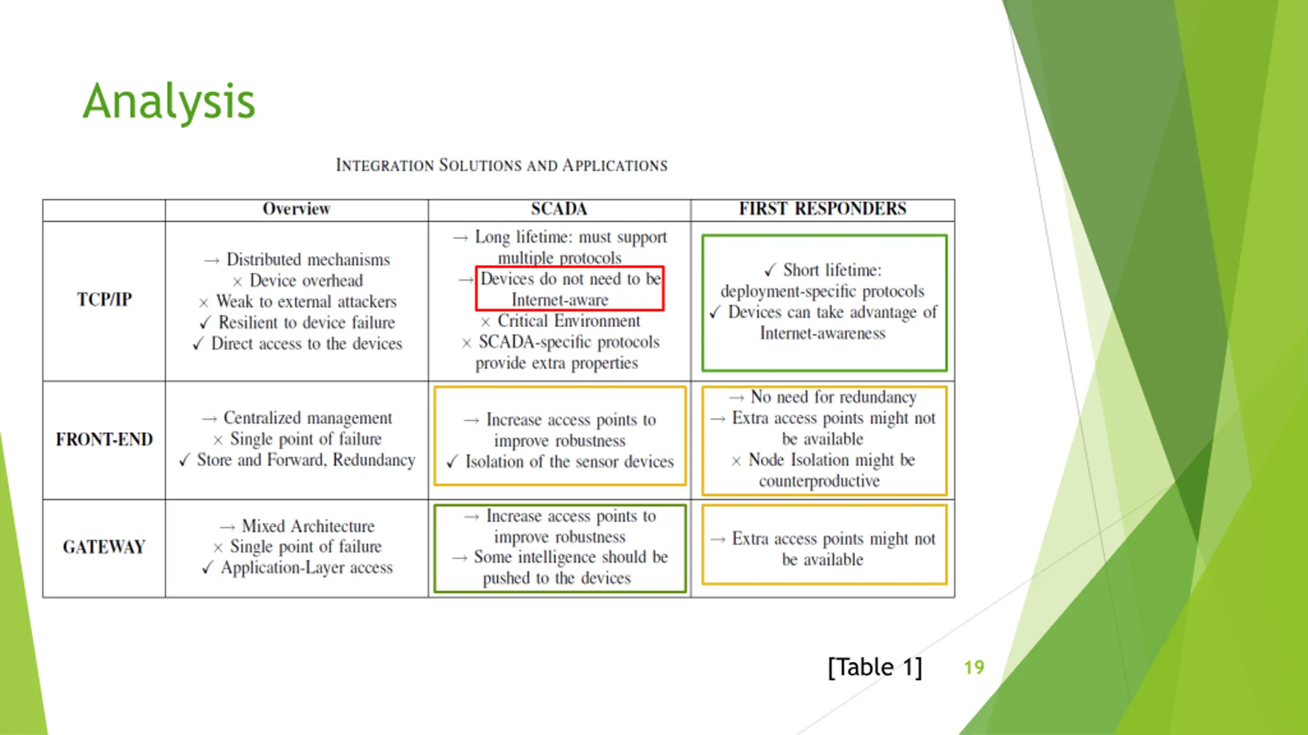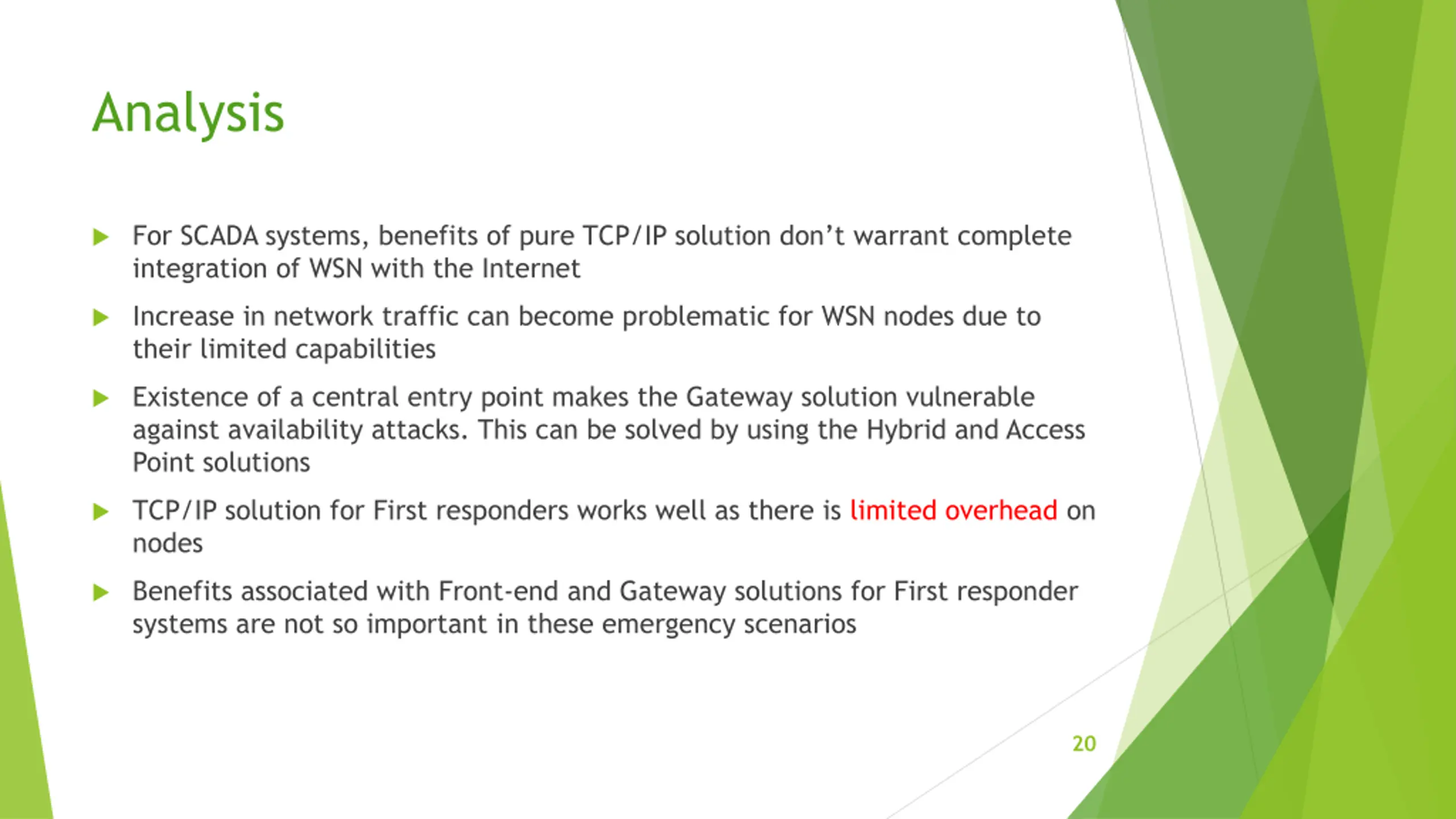 Analysis For SCADA systems, benefits of pure TCP/IP solution don t warrant complete integration of WSN with the Internet Increase in network traffic can become problematic for WSN nodes due to their limited capabilities Existence of a central entry point makes the Gateway solution vulnerable against availability attacks. This can be solved by using the Hybrid and Access Point solutions TCP/IP solution for First responders works well as there is limited overhead on nodes Benefits associated with Front-end and Gateway solutions for First responder systems are not so important in these emergency scenarios 20