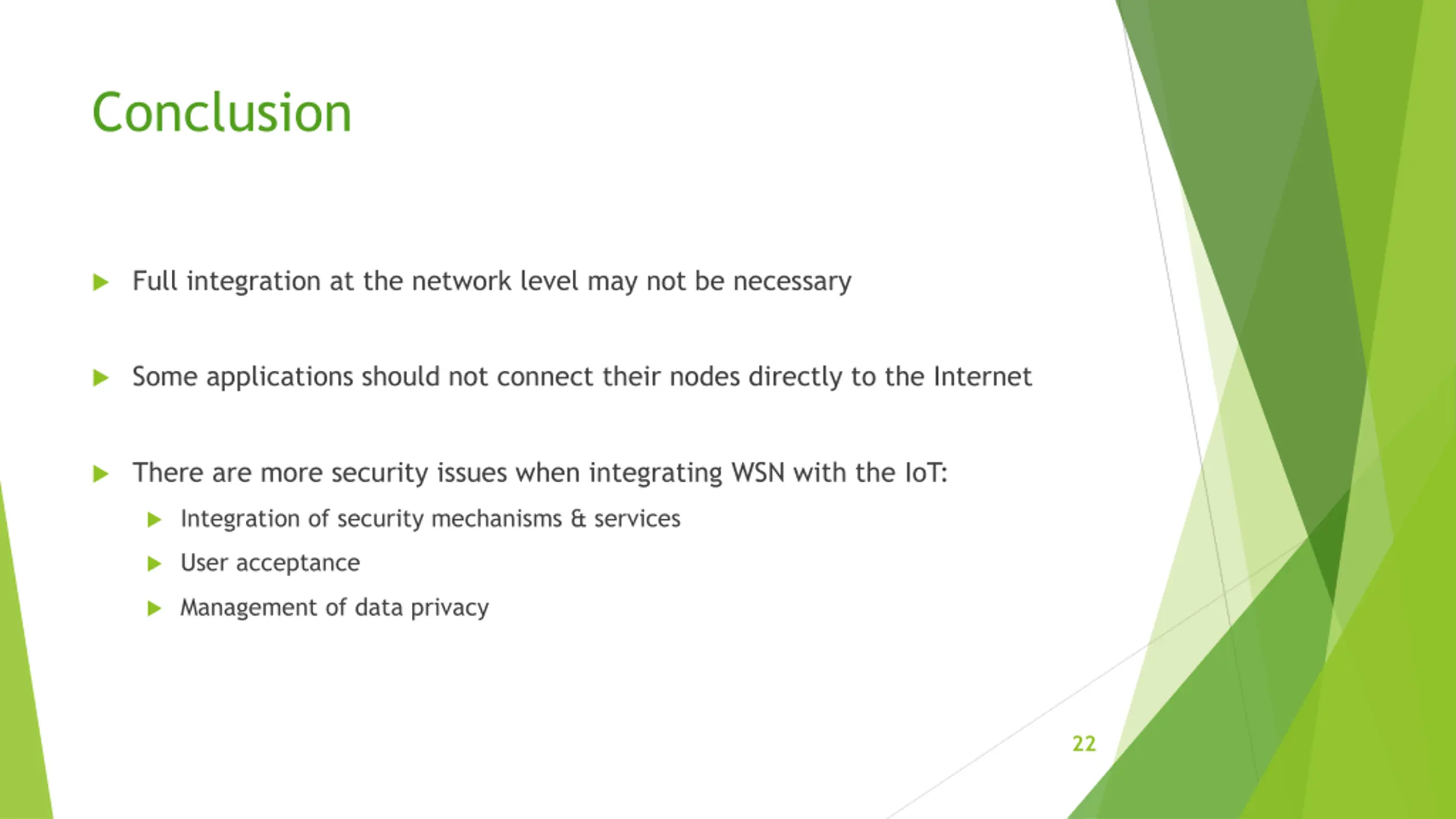 Conclusion Full integration at the network level may not be necessary Some applications should not connect their nodes directly to the Internet There are more security issues when integrating WSN with the IoT: Integration of security mechanisms & services User acceptance Management of data privacy 22