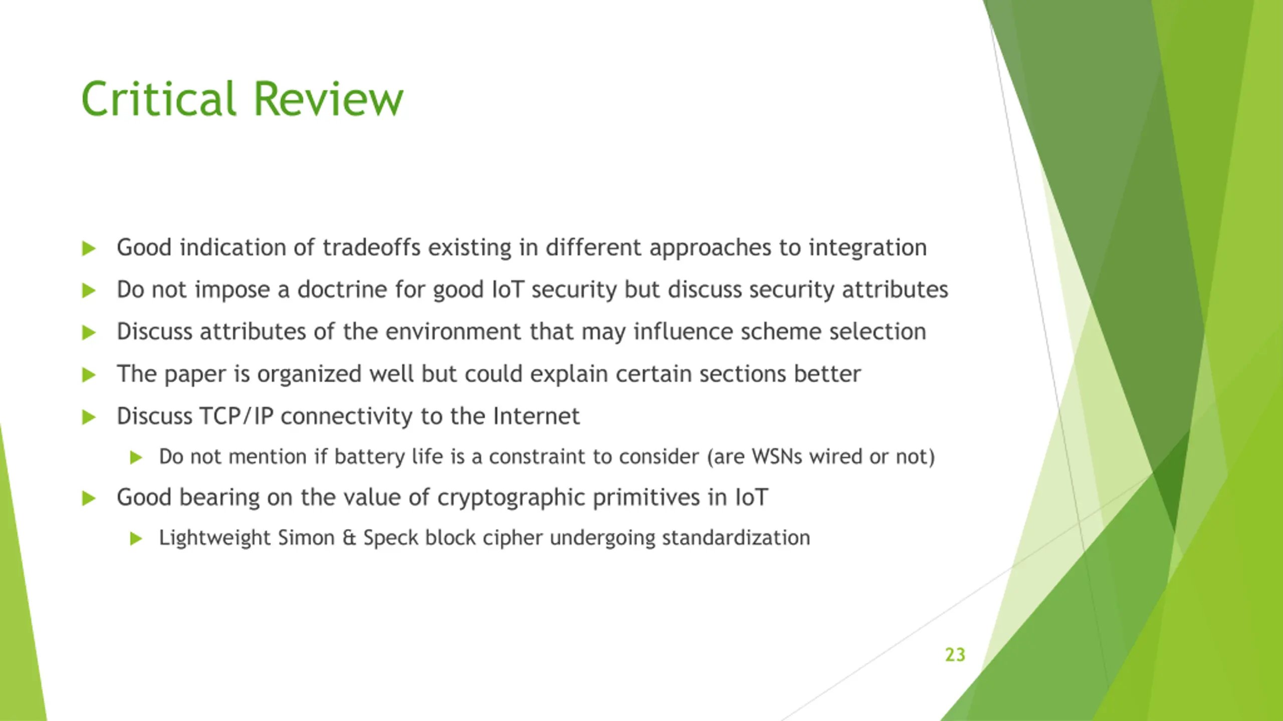Critical Review Good indication of tradeoffs existing in different approaches to integration Do not impose a doctrine for good IoT security but discuss security attributes Discuss attributes of the environment that may influence scheme selection The paper is organized well but could explain certain sections better Discuss TCP/IP connectivity to the Internet Do not mention if battery life is a constraint to consider (are WSNs wired or not) Good bearing on the value of cryptographic primitives in IoT Lightweight Simon & Speck block cipher undergoing standardization 23
