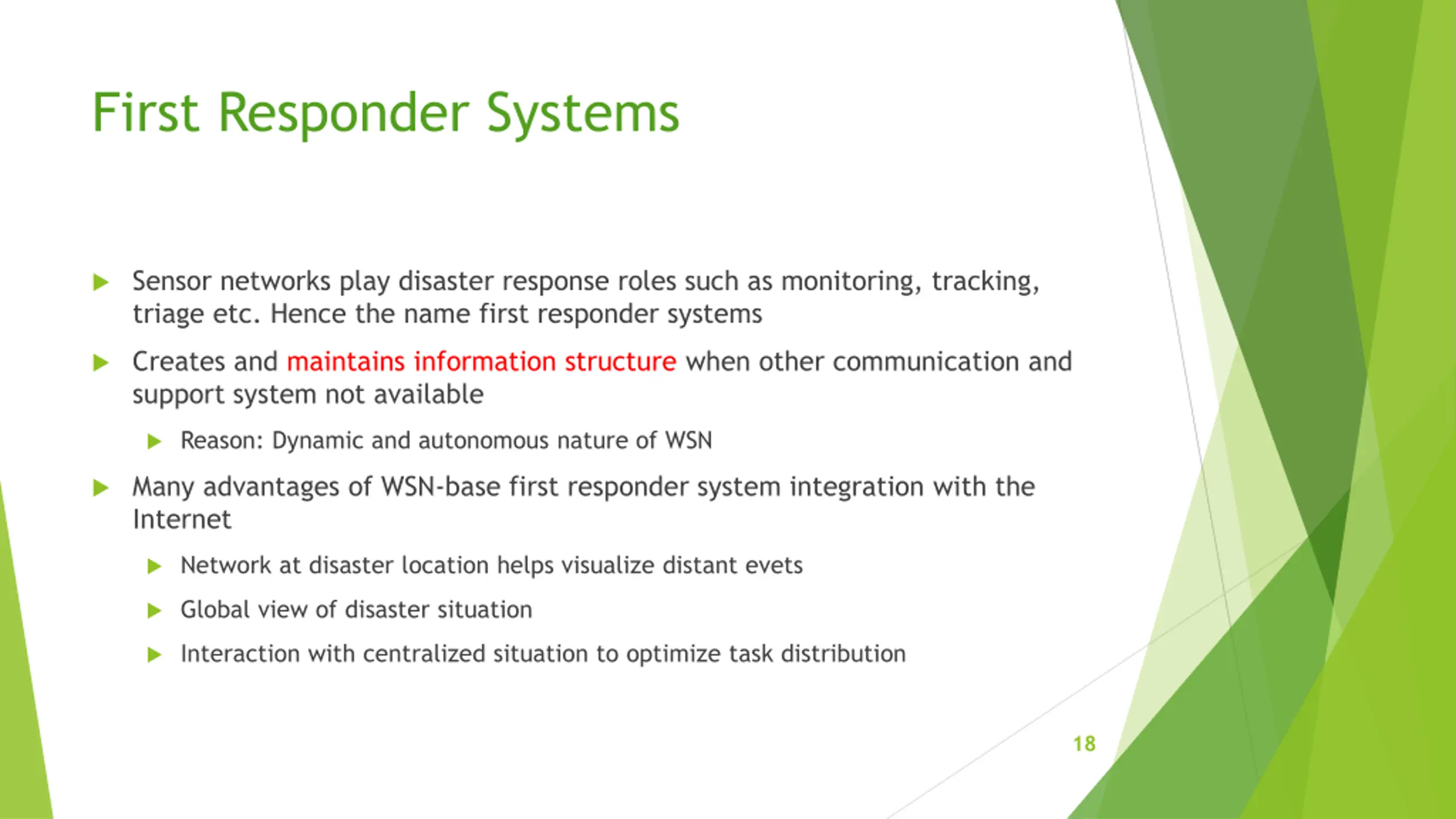 First Responder Systems Sensor networks play disaster response roles such as monitoring, tracking, triage etc. Hence the name first responder systems Creates and maintains information structure when other communication and support system not available Reason: Dynamic and autonomous nature of WSN Many advantages of WSN-base first responder system integration with the Internet Network at disaster location helps visualize distant evets Global view of disaster situation Interaction with centralized situation to optimize task distribution 18