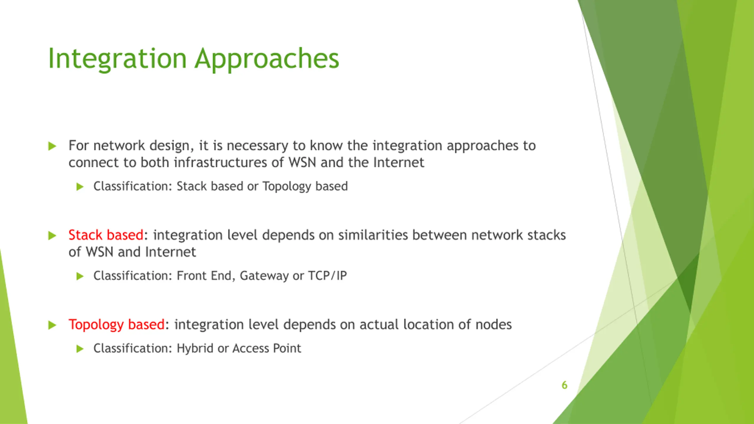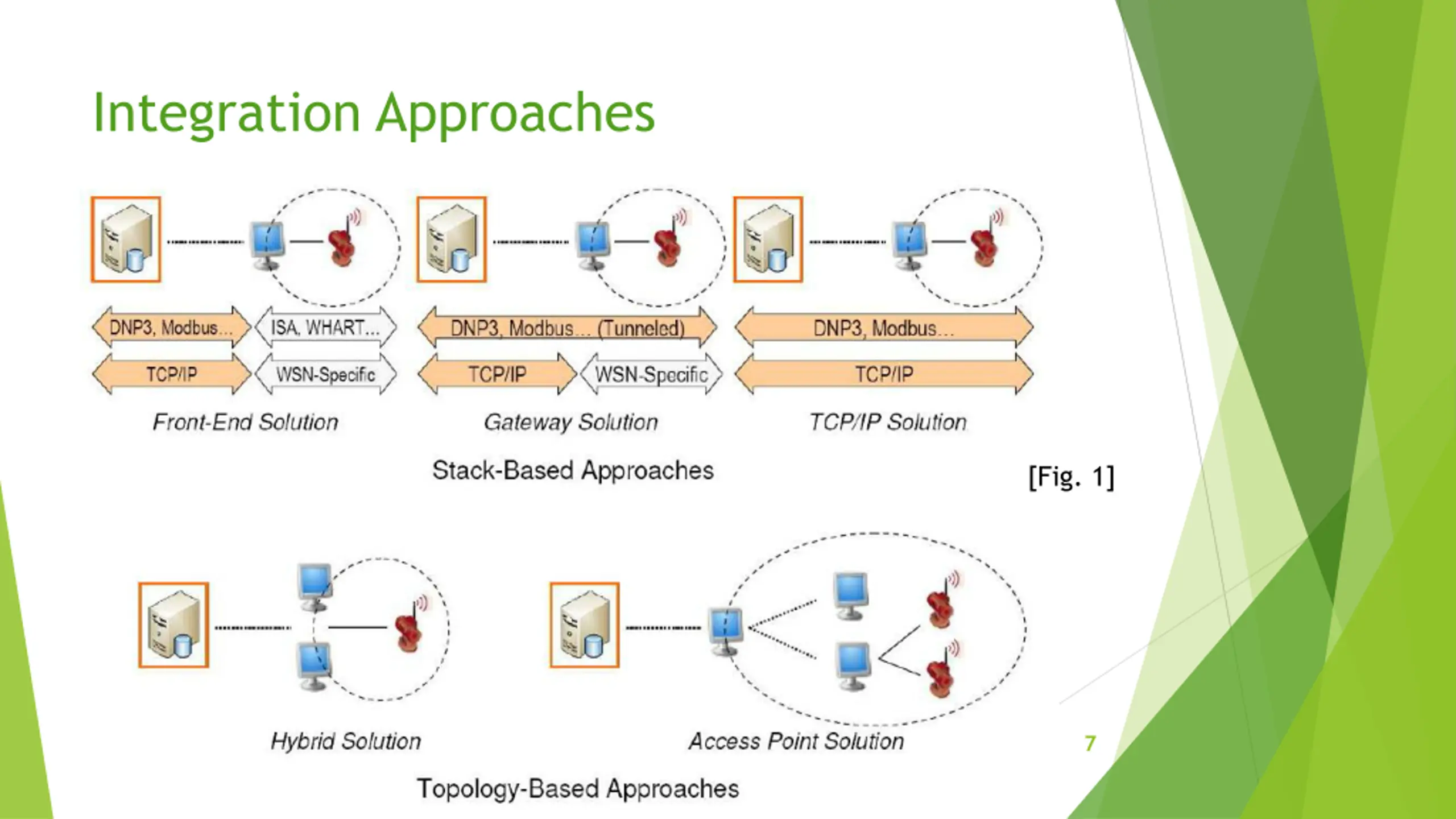 Integration Approaches For network design, it is necessary to know the integration approaches to connect to both infrastructures of WSN and the Internet Classification: Stack based or Topology based Stack based: integration level depends on similarities between network stacks of WSN and Internet Classification: Front End, Gateway or TCP/IP Topology based: integration level depends on actual location of nodes Classification: Hybrid or Access Point 6