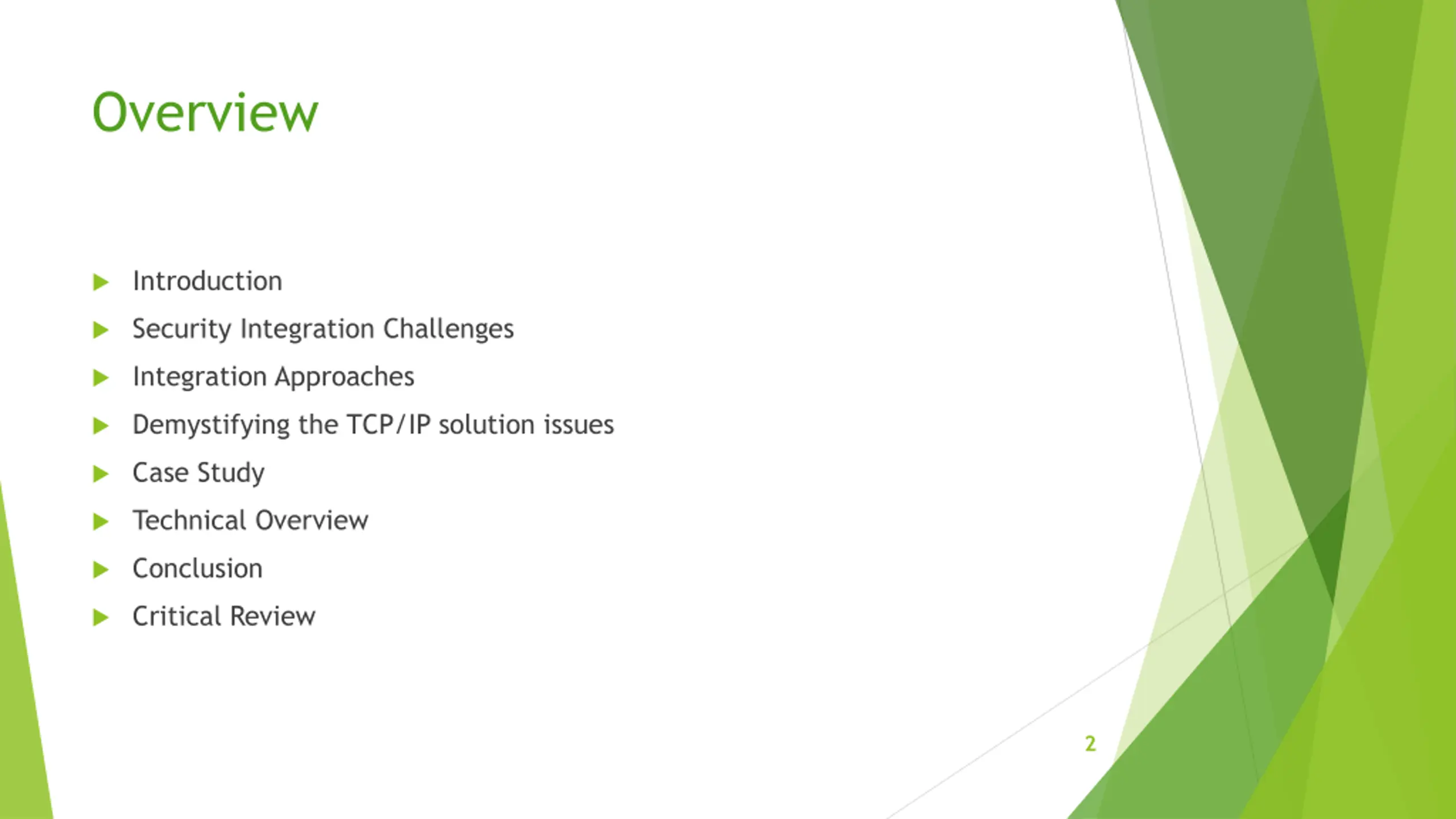 Overview Introduction Security Integration Challenges Integration Approaches Demystifying the TCP/IP solution issues Case Study Technical Overview Conclusion Critical Review 2