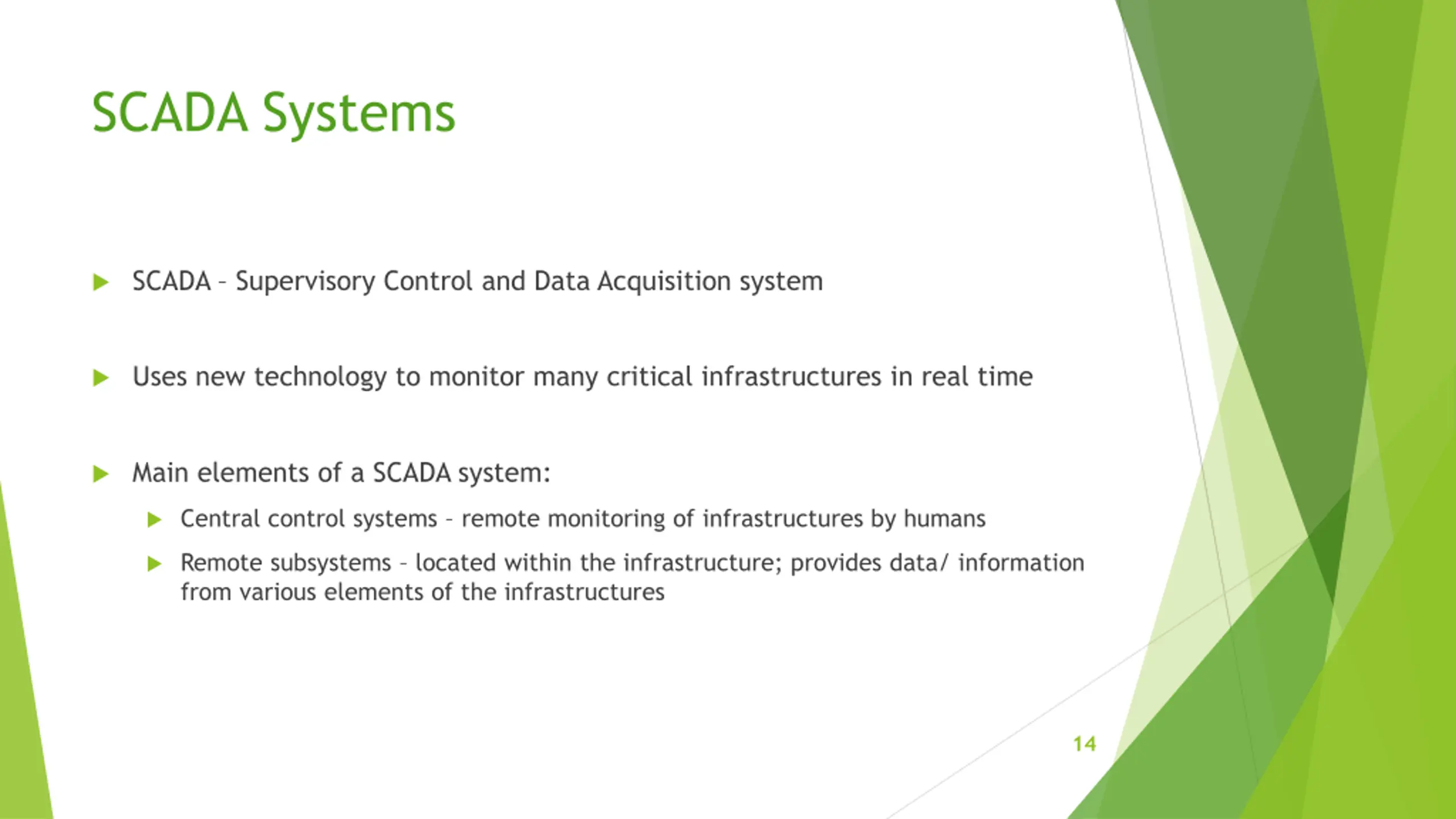 SCADA Systems SCADA Supervisory Control and Data Acquisition system Uses new technology to monitor many critical infrastructures in real time Main elements of a SCADA system: Central control systems remote monitoring of infrastructures by humans Remote subsystems located within the infrastructure; provides data/ information from various elements of the infrastructures 14