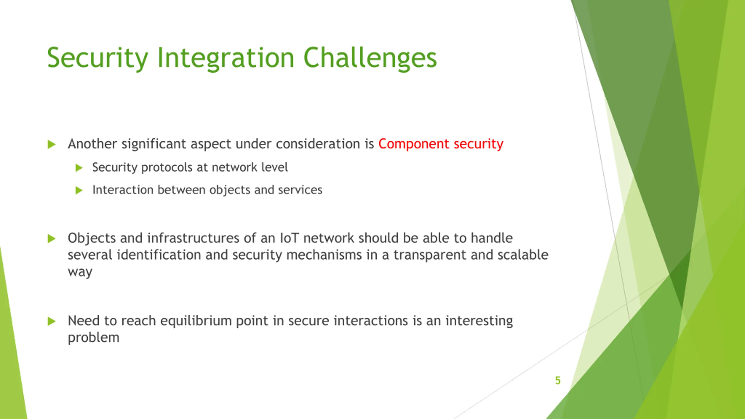 Security Integration Challenges WSN in IoT raises security challenges; paper focuses on connections at network level Security needs to be considered at a global perspective, not just local Ensures the curbing of additional requirements to integrate local nodes on a global scale Security is an important factor as it helps user perceive control over information and not vice versa Data privacy is another important feature Segregation of shared and private data Confidentiality in business scenarios 4