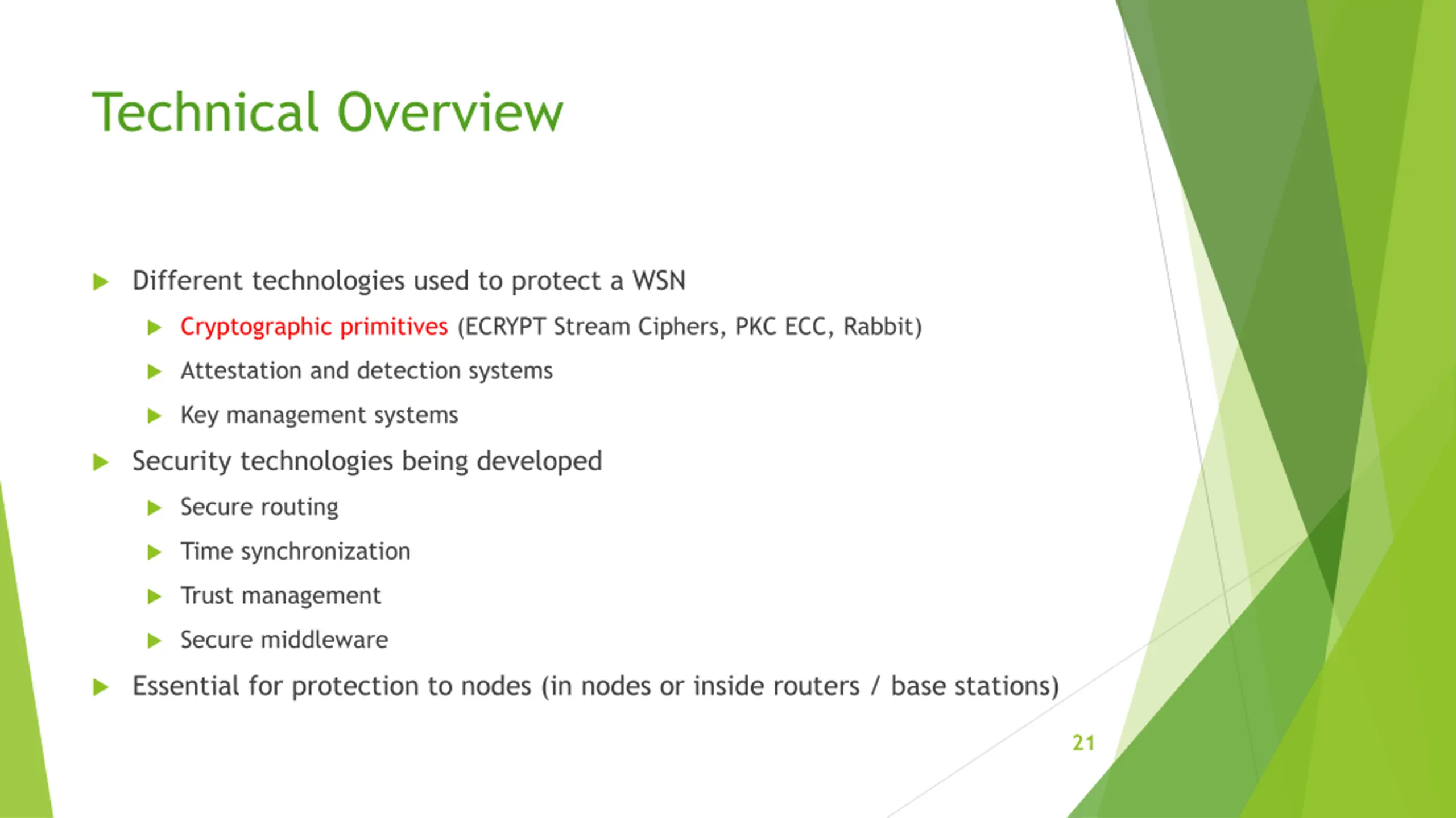 Technical Overview Different technologies used to protect a WSN Cryptographic primitives (ECRYPT Stream Ciphers, PKC ECC, Rabbit) Attestation and detection systems Key management systems Security technologies being developed Secure routing Time synchronization Trust management Secure middleware Essential for protection to nodes (in nodes or inside routers / base stations) 21