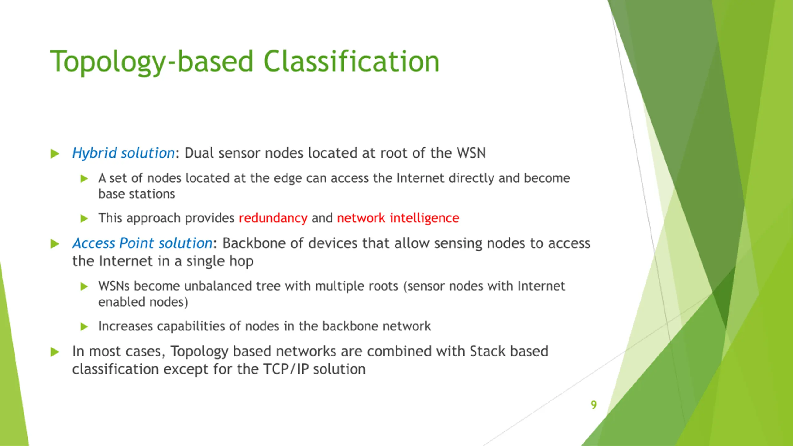 Stack-based Classification Front-end solution: WSN independent from the Internet Implements its own protocols All interaction managed by a centralized base station Gateway solution: WSN can exchange information with Internet hosts Internet hosts and sensor nodes can address each other indirectly through a gateway Base station acts as application layer gateway; translating lower layer protocols and routing information TCP/IP solution: WSN shares a compatible network layer protocol Sensor nodes implement TCP/IP (or 6LoWPAN) to become a part of the Internet Sensor nodes may not be able to use specific WSN protocols 8
