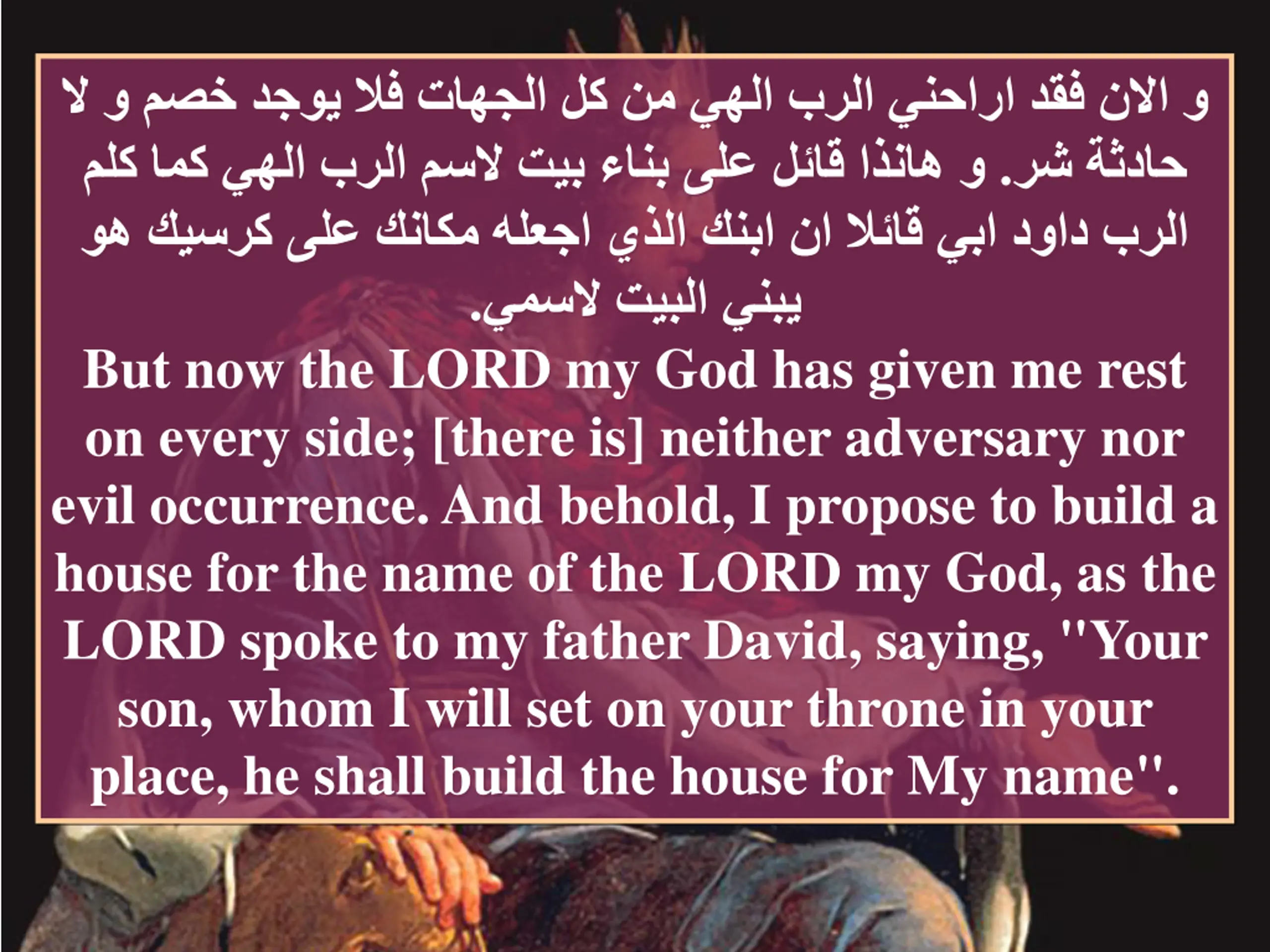 . But now the LORD my God has given me rest on every side; [there is] neither adversary nor evil occurrence. And behold, I propose to build a house for the name of the LORD my God, as the LORD spoke to my father David, saying, "Your son, whom I will set on your throne in your place, he shall build the house for My name". .