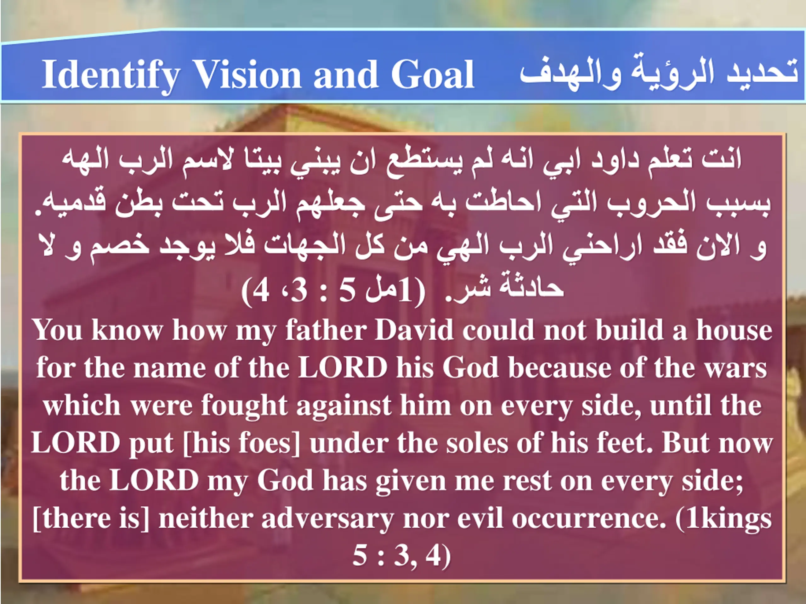 Identify Vision and Goal ( 1 5 : 3 4 ) You know how my father David could not build a house for the name of the LORD his God because of the wars which were fought against him on every side, until the LORD put [his foes] under the soles of his feet. But now the LORD my God has given me rest on every side; [there is] neither adversary nor evil occurrence. (1kings 5 : 3, 4) . .