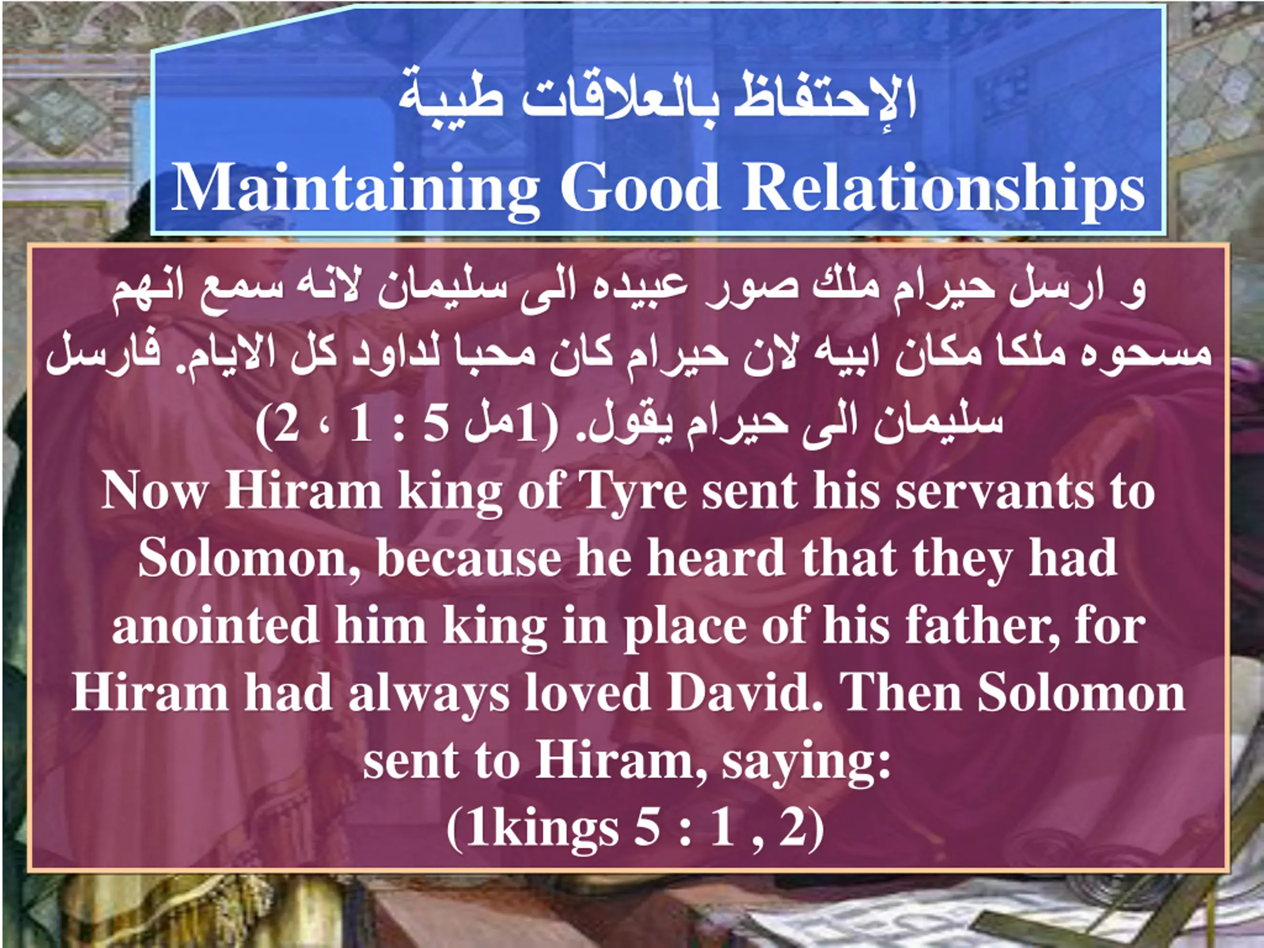 Maintaining Good Relationships . ( . 1 5 : 1 2 ) Now Hiram king of Tyre sent his servants to Solomon, because he heard that they had anointed him king in place of his father, for Hiram had always loved David.Then Solomon sent to Hiram, saying: (1kings 5 : 1 , 2)
