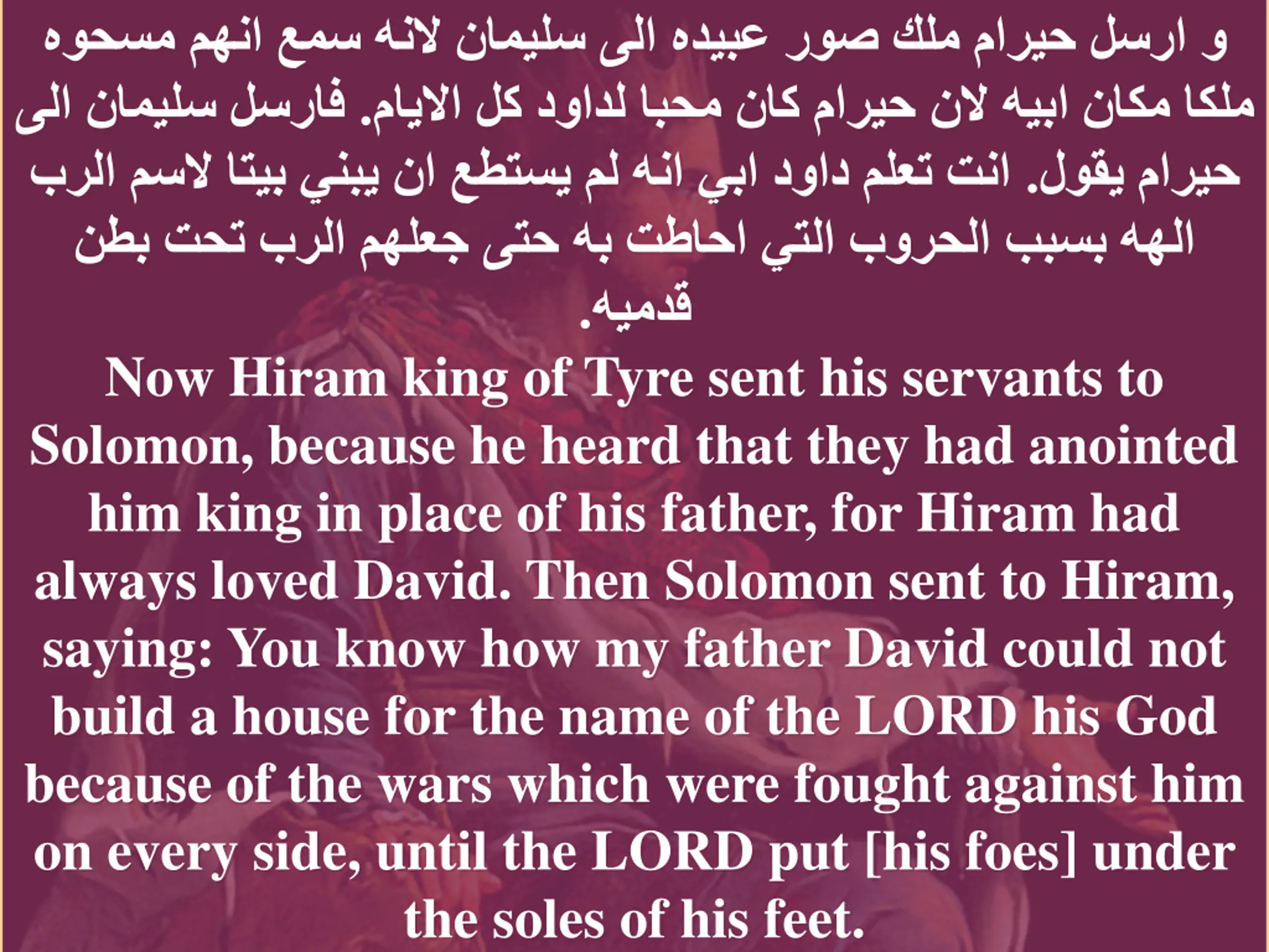 . . Now Hiram king of Tyre sent his servants to Solomon, because he heard that they had anointed him king in place of his father, for Hiram had always loved David. Then Solomon sent to Hiram, saying: You know how my father David could not build a house for the name of the LORD his God because of the wars which were fought against him on every side, until the LORD put [his foes] under the soles of his feet. .