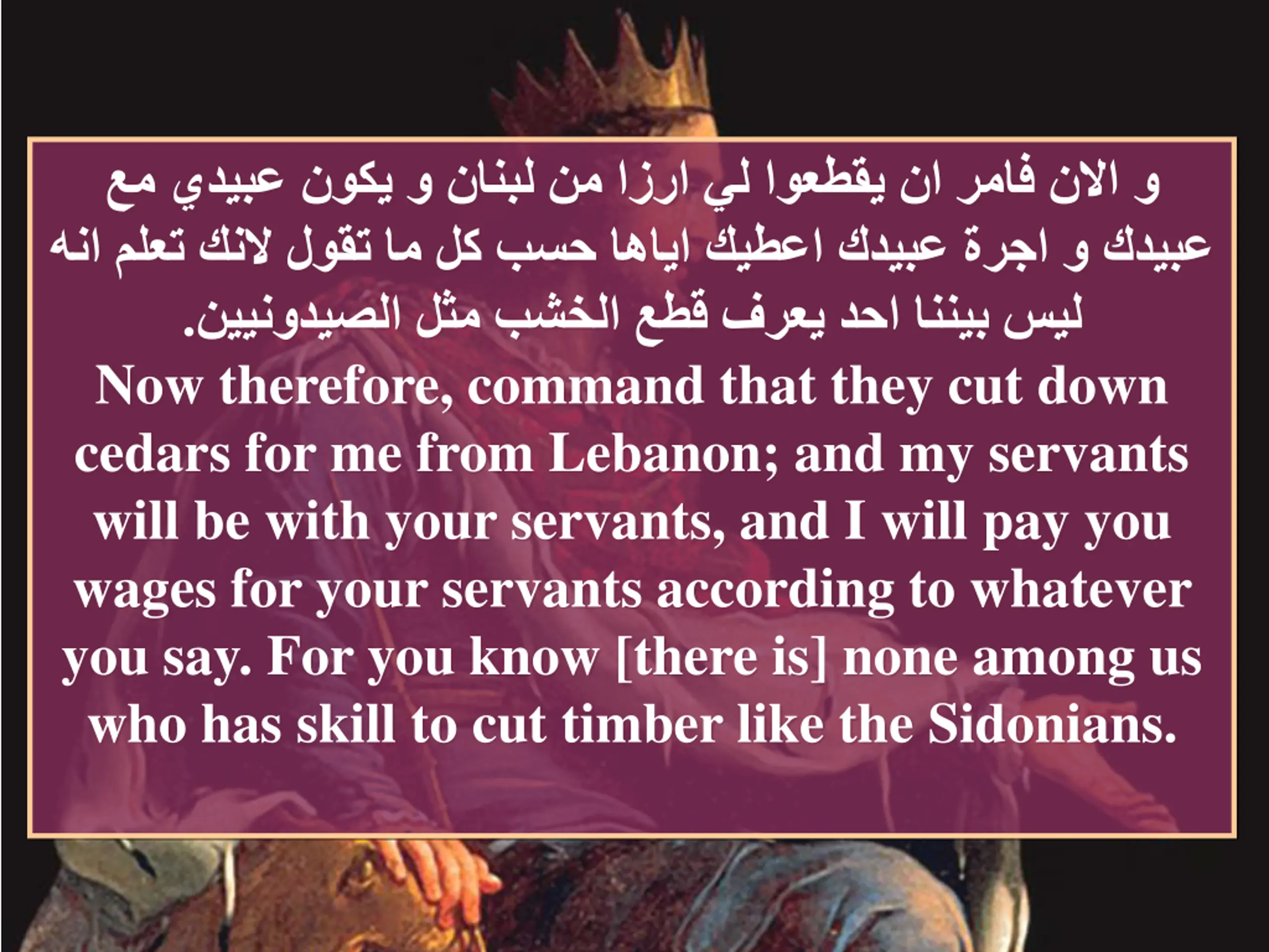 . Now therefore, command that they cut down cedars for me from Lebanon; and my servants will be with your servants, and I will pay you wages for your servants according to whatever you say. For you know [there is] none among us who has skill to cut timber like the Sidonians.