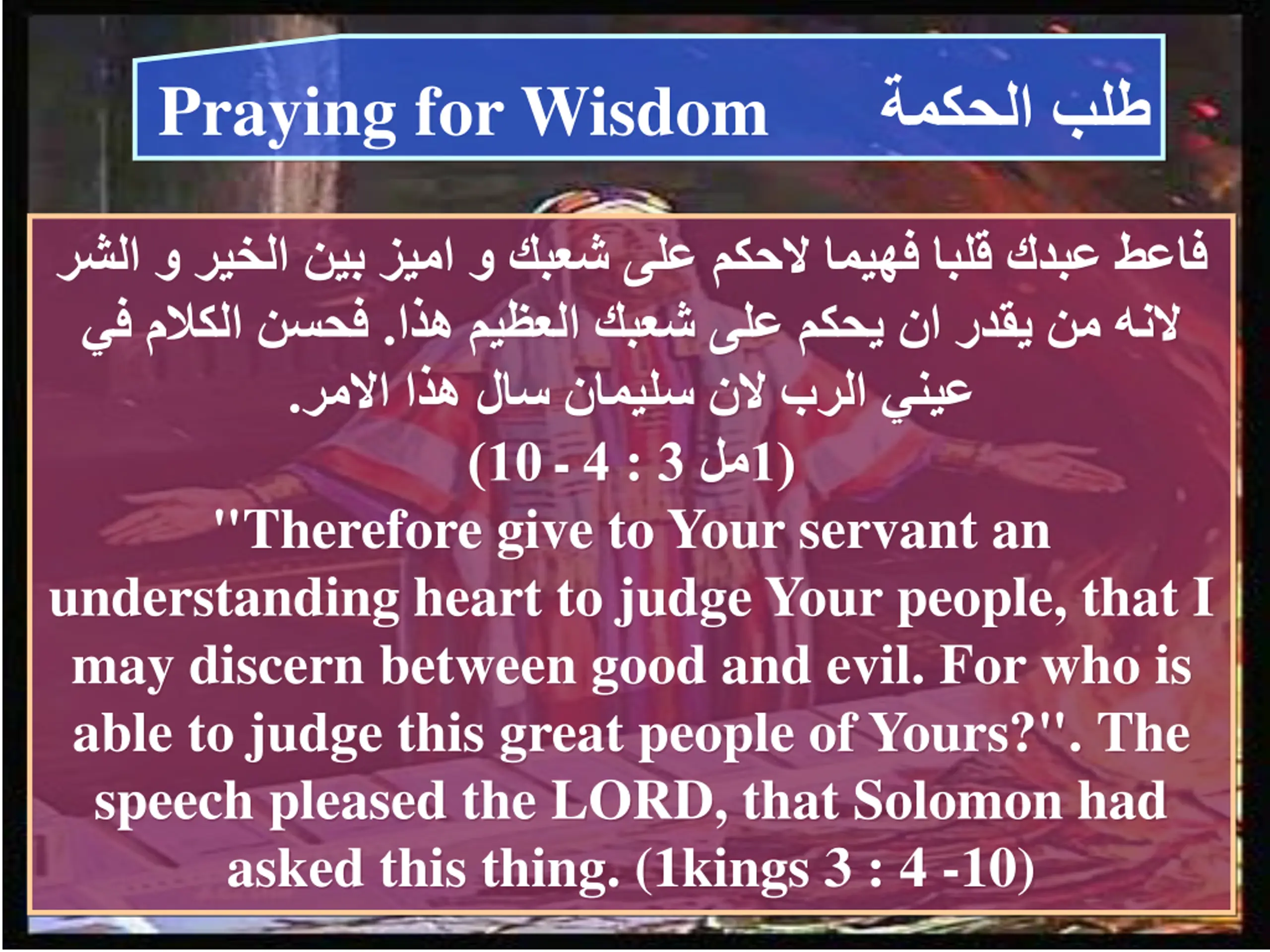 Praying for Wisdom . . 3 : 4 10 ) "Therefore give to Your servant an understanding heart to judge Your people, that I may discern between good and evil. For who is able to judge this great people of Yours?".The speech pleased the LORD, that Solomon had asked this thing.(1kings 3 : 4 -10) ( 1