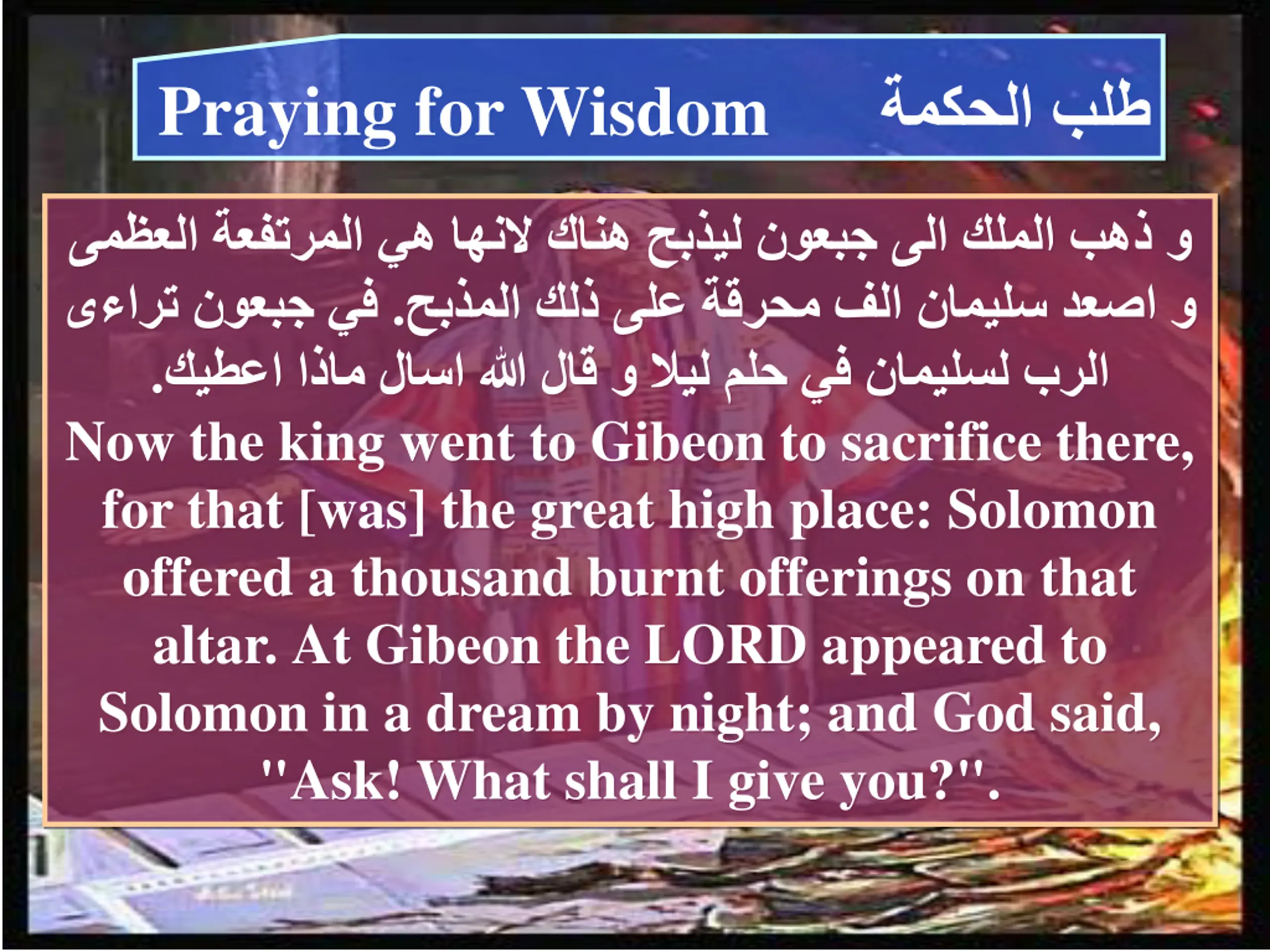 Praying for Wisdom . . Now the king went to Gibeon to sacrifice there, for that [was] the great high place: Solomon offered a thousand burnt offerings on that altar.At Gibeon the LORD appeared to Solomon in a dream by night; and God said, "Ask! What shall I give you?".