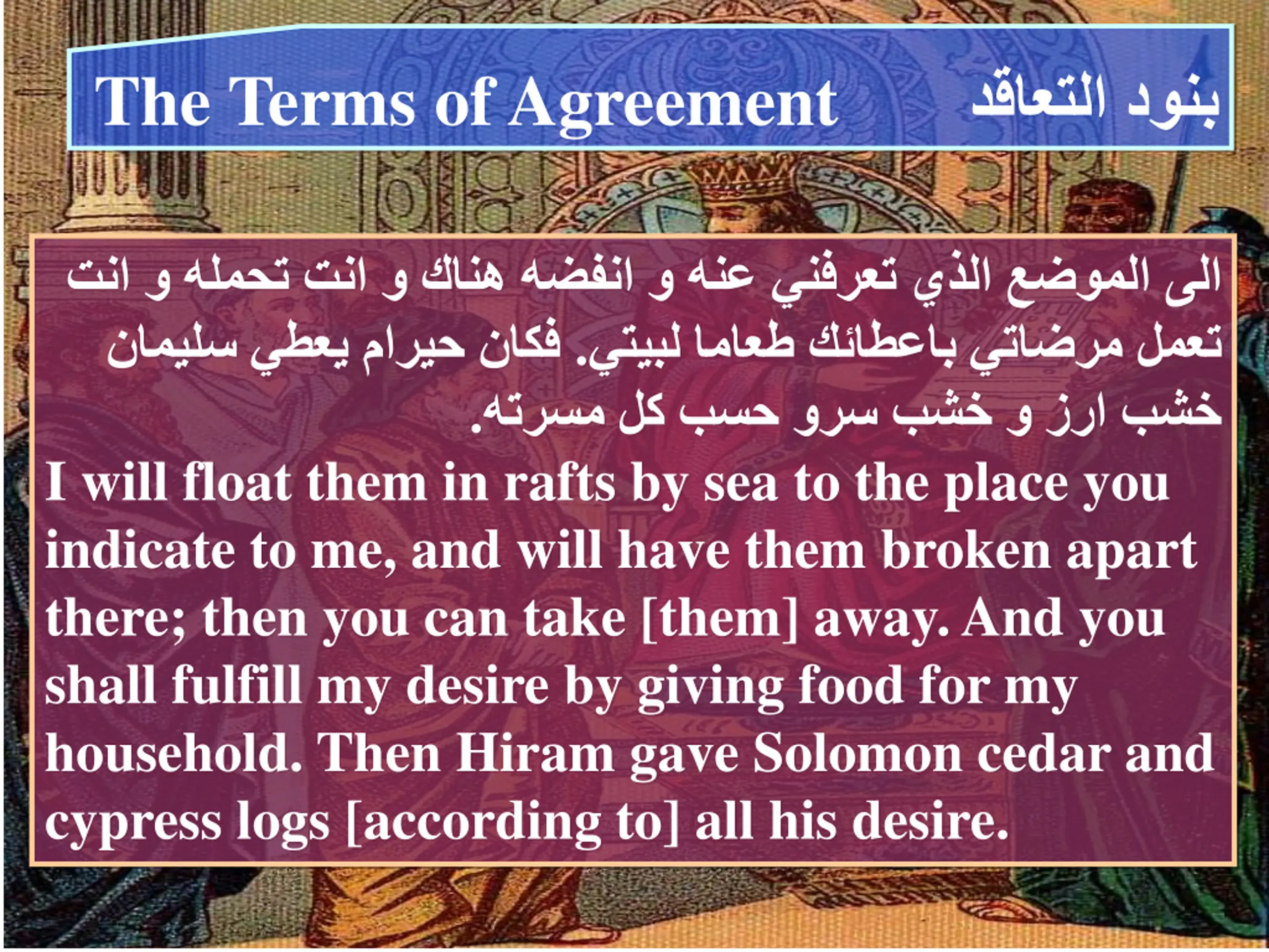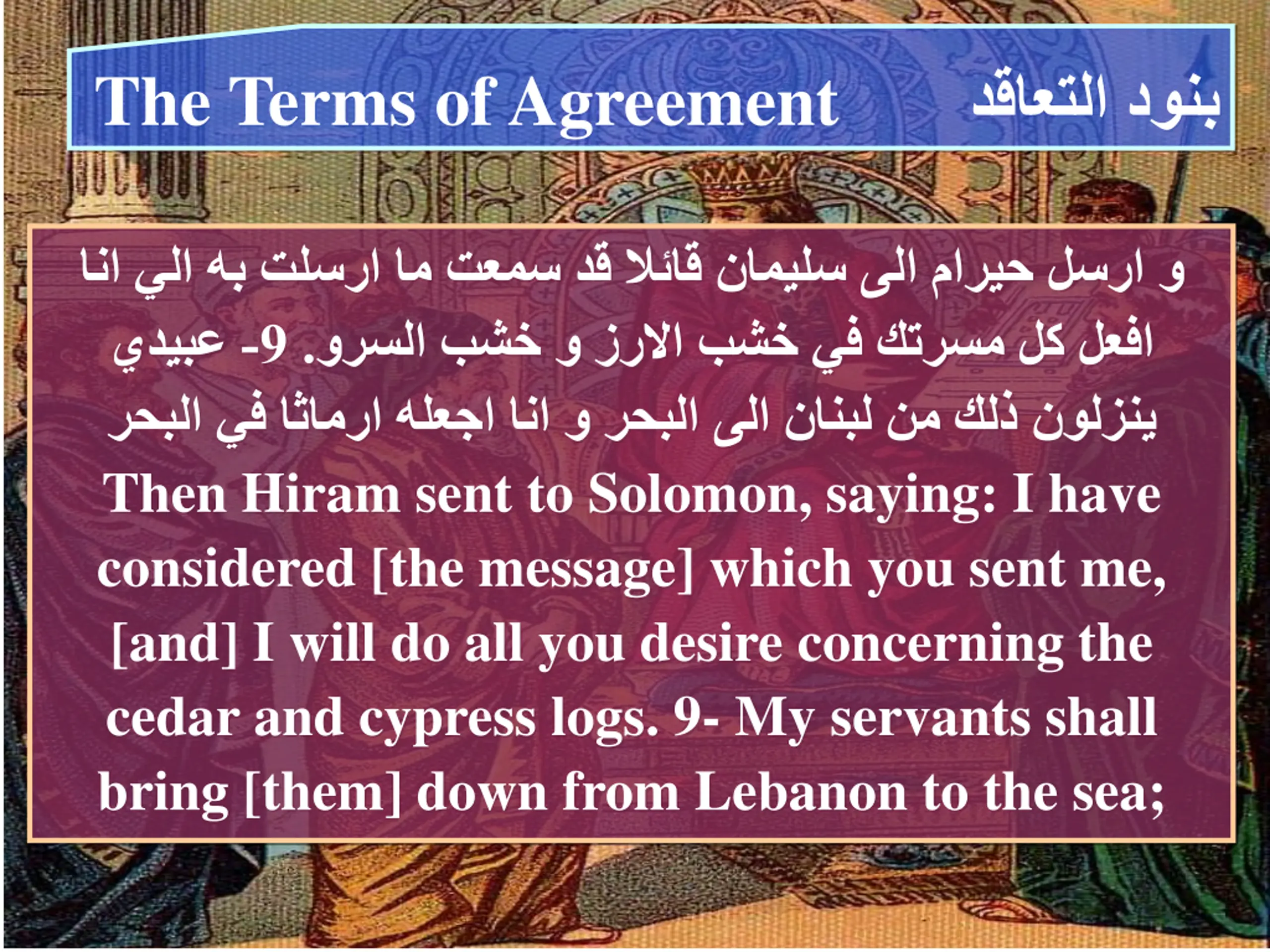 The Terms ofAgreement . 9 - Then Hiram sent to Solomon, saying: I have considered [the message] which you sent me, [and] I will do all you desire concerning the cedar and cypress logs. 9- My servants shall bring [them] down from Lebanon to the sea;