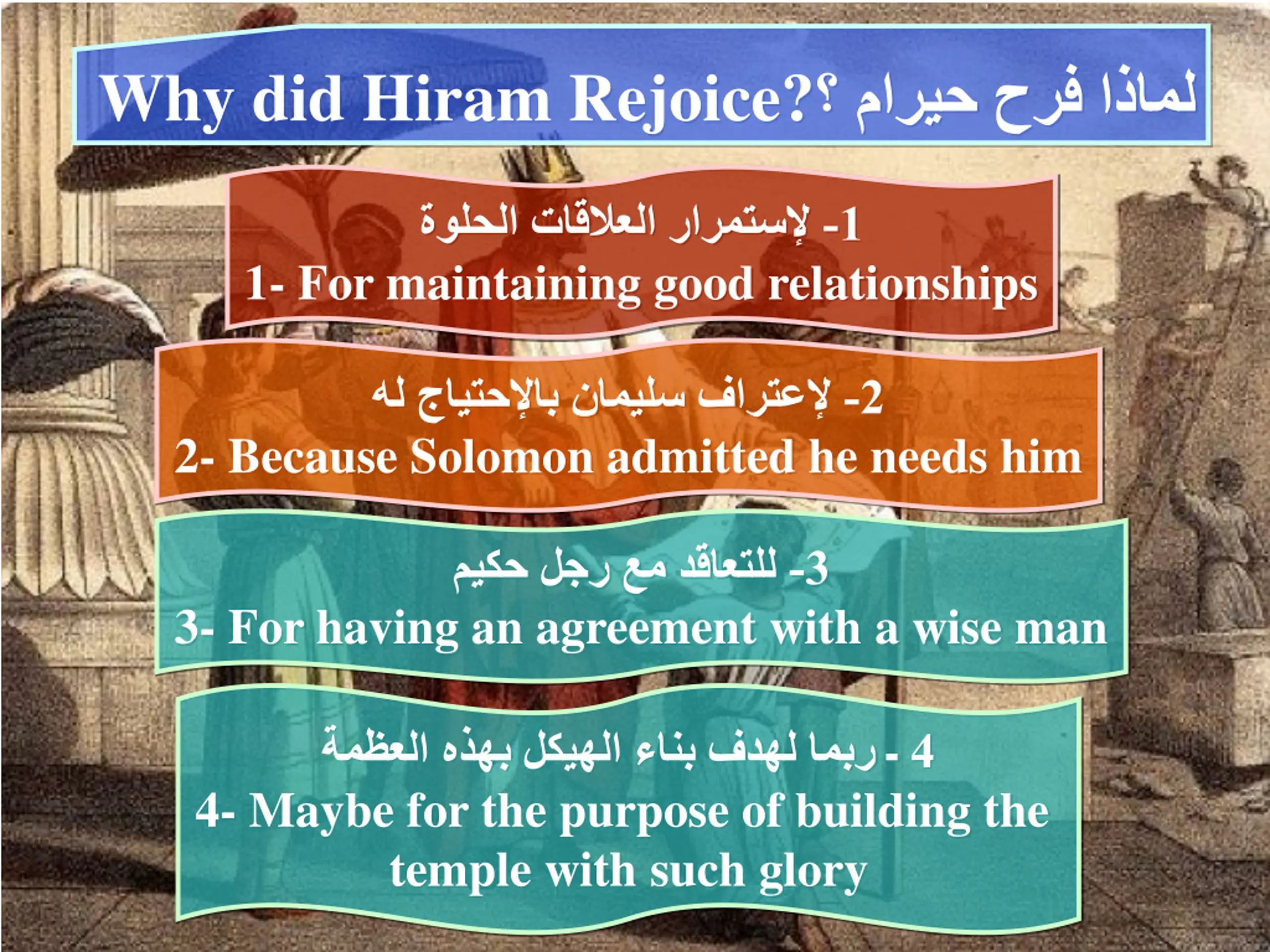 Why did Hiram Rejoice? 1- 1- For maintaining good relationships 1- For maintaining good relationships 1 - 2- 2- Because Solomon admitted he needs him 2- Because Solomon admitted he needs him 2 - 3- 3- For having an agreement with a wise man 3 - 3- For having an agreement with a wise man 4 4- Maybe for the purpose of building the temple with such glory 4- Maybe for the purpose of building the temple with such glory 4
