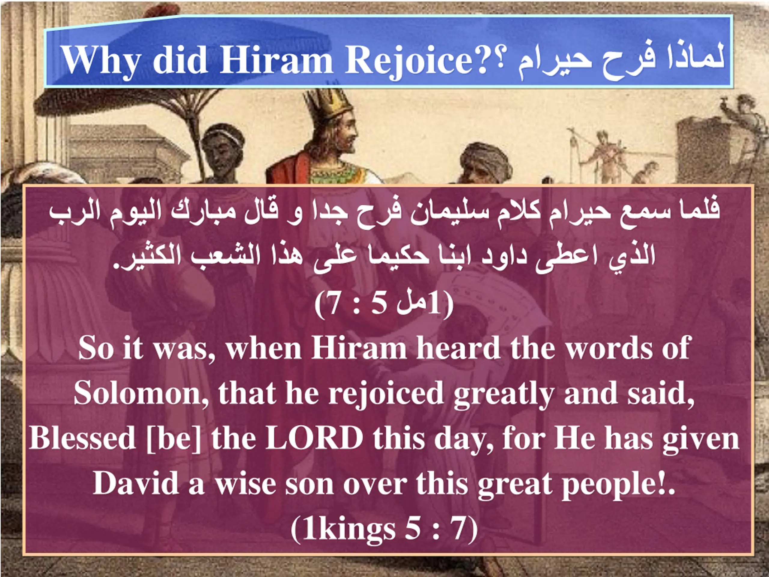 Why did Hiram Rejoice? . 5 : 7 ) So it was, when Hiram heard the words of Solomon, that he rejoiced greatly and said, Blessed [be] the LORD this day, for He has given David a wise son over this great people!. (1kings 5 : 7) ( 1