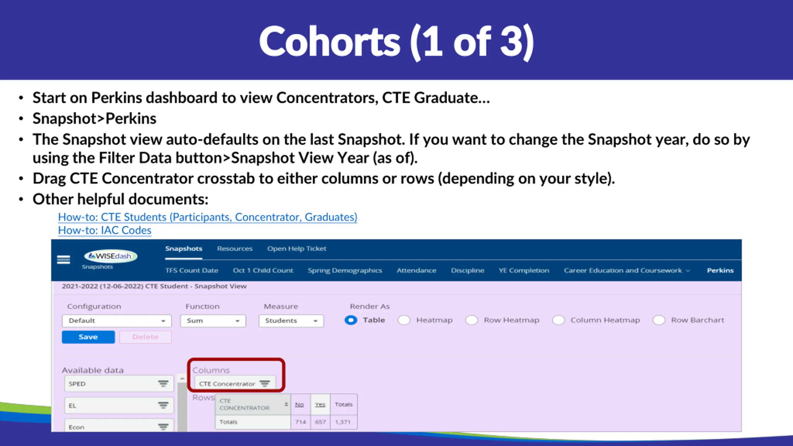 Cohorts (1 of 3) Cohorts (1 of 3) Start on Perkins dashboard to view Concentrators, CTE Graduate Snapshot>Perkins The Snapshot view auto-defaults on the last Snapshot. If you want to change the Snapshot year, do so by using the Filter Data button>Snapshot View Year (as of). Drag CTE Concentrator crosstab to either columns or rows (depending on your style). Other helpful documents: How-to: CTE Students (Participants, Concentrator, Graduates) How-to: IAC Codes How-to: Two Subgroups