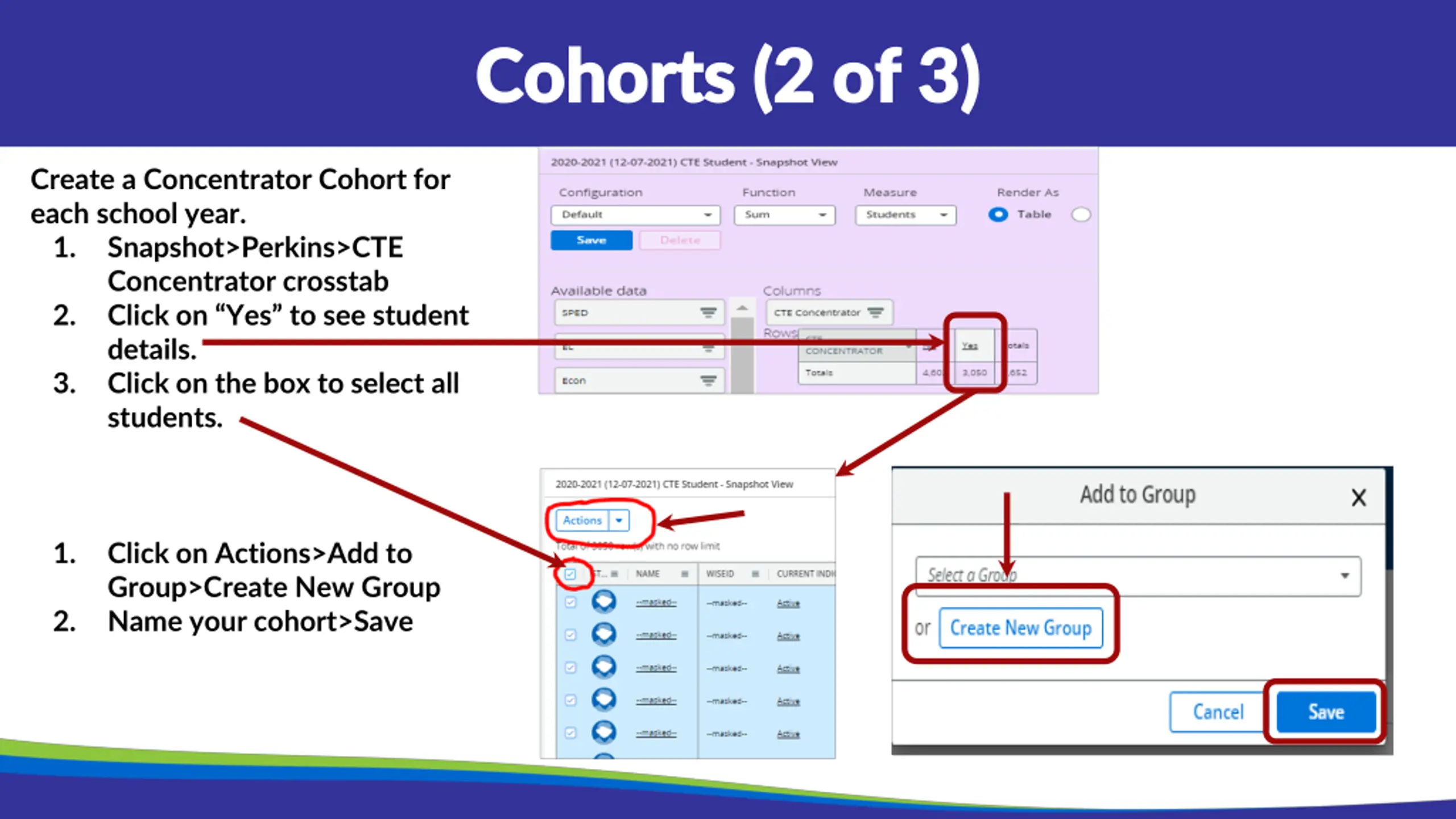 Cohorts (2 of 3) Cohorts (2 of 3) Create a Concentrator Cohort for each school year. 1. Snapshot>Perkins>CTE Concentrator crosstab 2. Click on Yes to see student details. 3. Click on the box to select all students. 1. Click on Actions>Add to Group>Create New Group Name your cohort>Save 2.