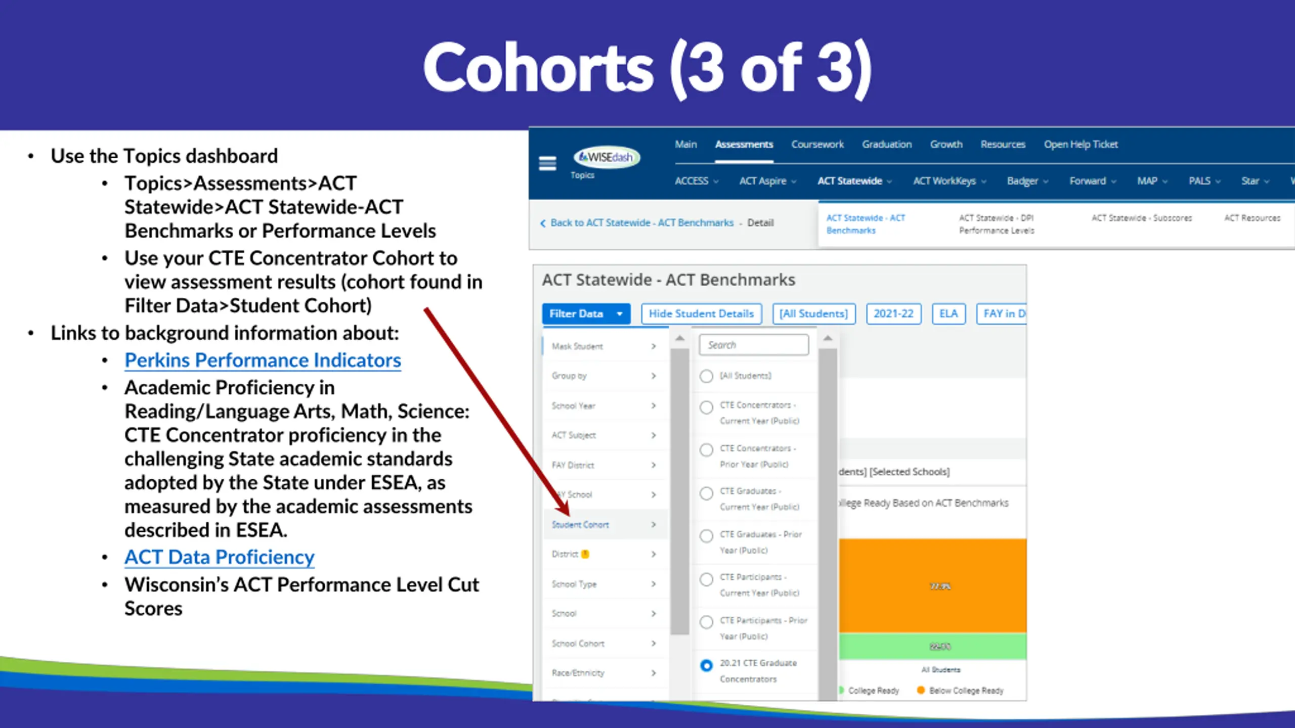 Cohorts (3 of 3) Cohorts (3 of 3) Use the Topics dashboard Topics>Assessments>ACT Statewide>ACT Statewide-ACT Benchmarks or Performance Levels Use your CTE Concentrator Cohort to view assessment results (cohort found in Filter Data>Student Cohort) Links to background information about: Perkins Performance Indicators Academic Proficiency in Reading/Language Arts, Math, Science: CTE Concentrator proficiency in the challenging State academic standards adopted by the State under ESEA, as measured by the academic assessments described in ESEA. ACT Data Proficiency Wisconsin s ACT Performance Level Cut Scores