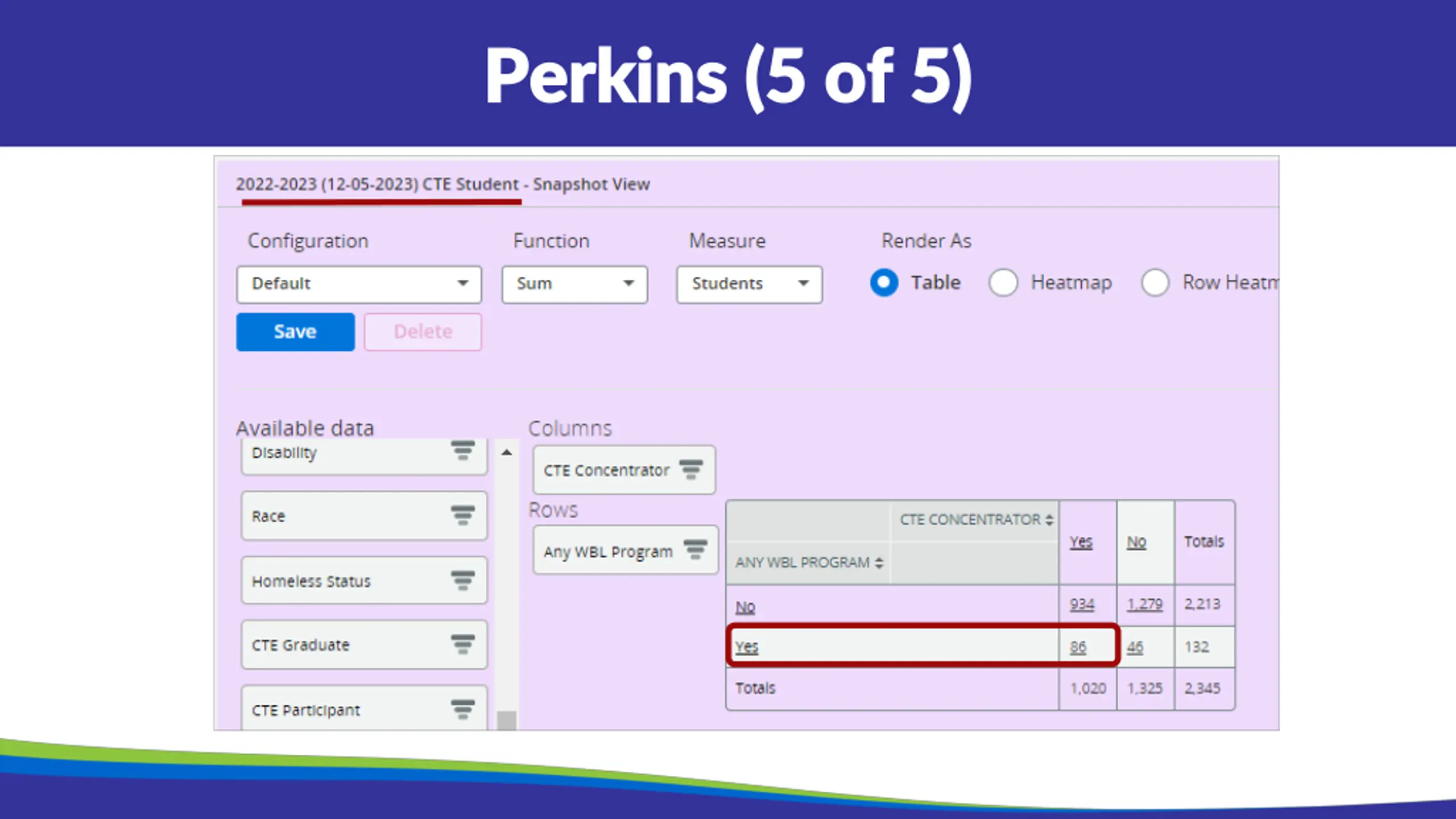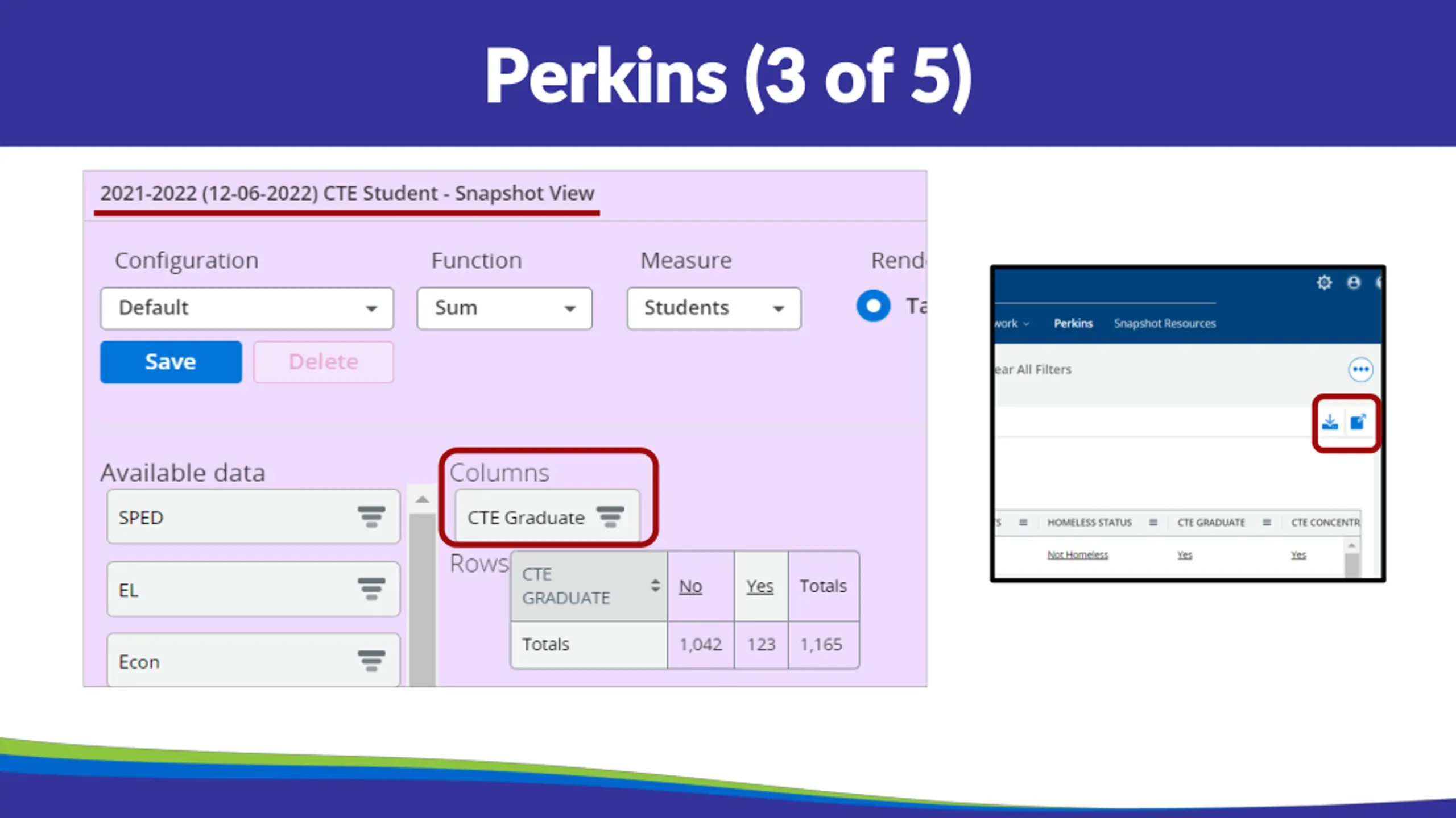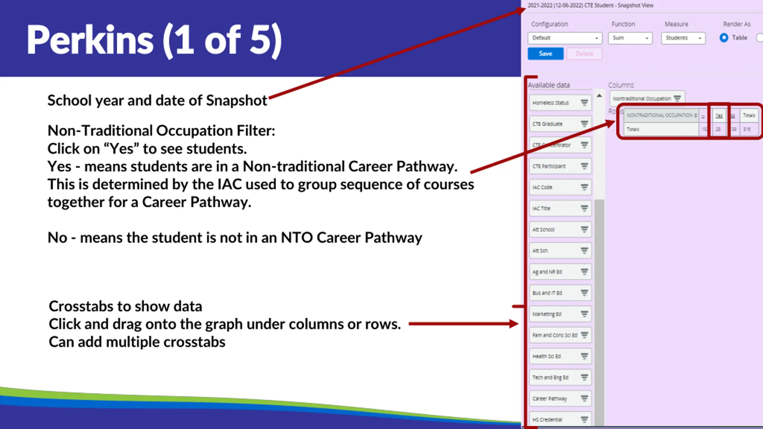 Perkins (1 of 5) Perkins (1 of 5) School year and date of Snapshot Non-Traditional Occupation Filter: Click on Yes to see students. Yes - means students are in a Non-traditional Career Pathway. This is determined by the IAC used to group sequence of courses together for a Career Pathway. No - means the student is not in an NTO Career Pathway Crosstabs to show data Click and drag onto the graph under columns or rows. Can add multiple crosstabs