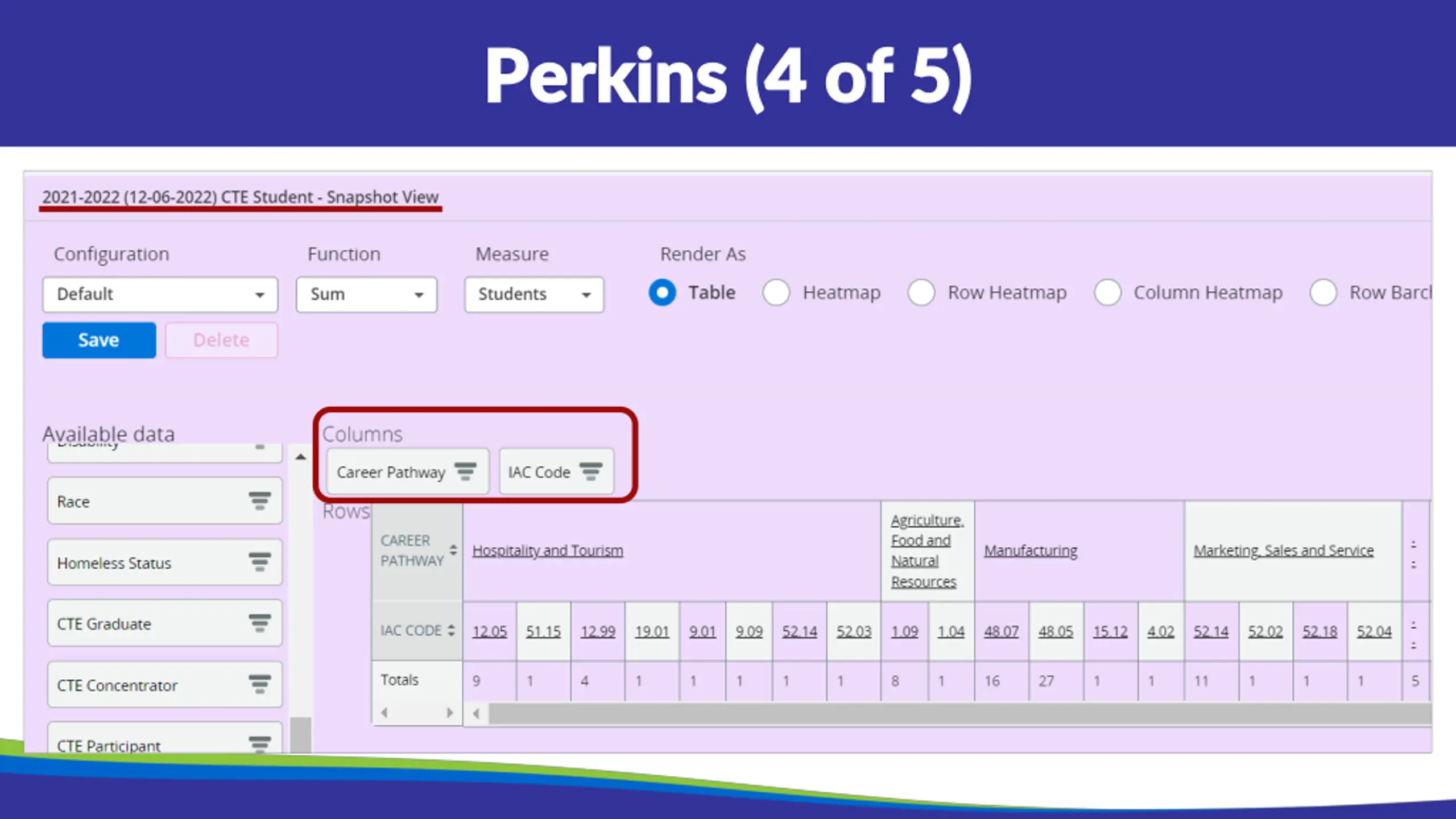 Perkins (2 of 5) Perkins (2 of 5) This is a pivot table using IAC Title, IAC Code, and Race. It shows the breakdown by IAC Title. You can select the individual IAC Title and download a spreadsheet of student details. Not enough information to be a Concentrator. Could be a Participant, or missing data.