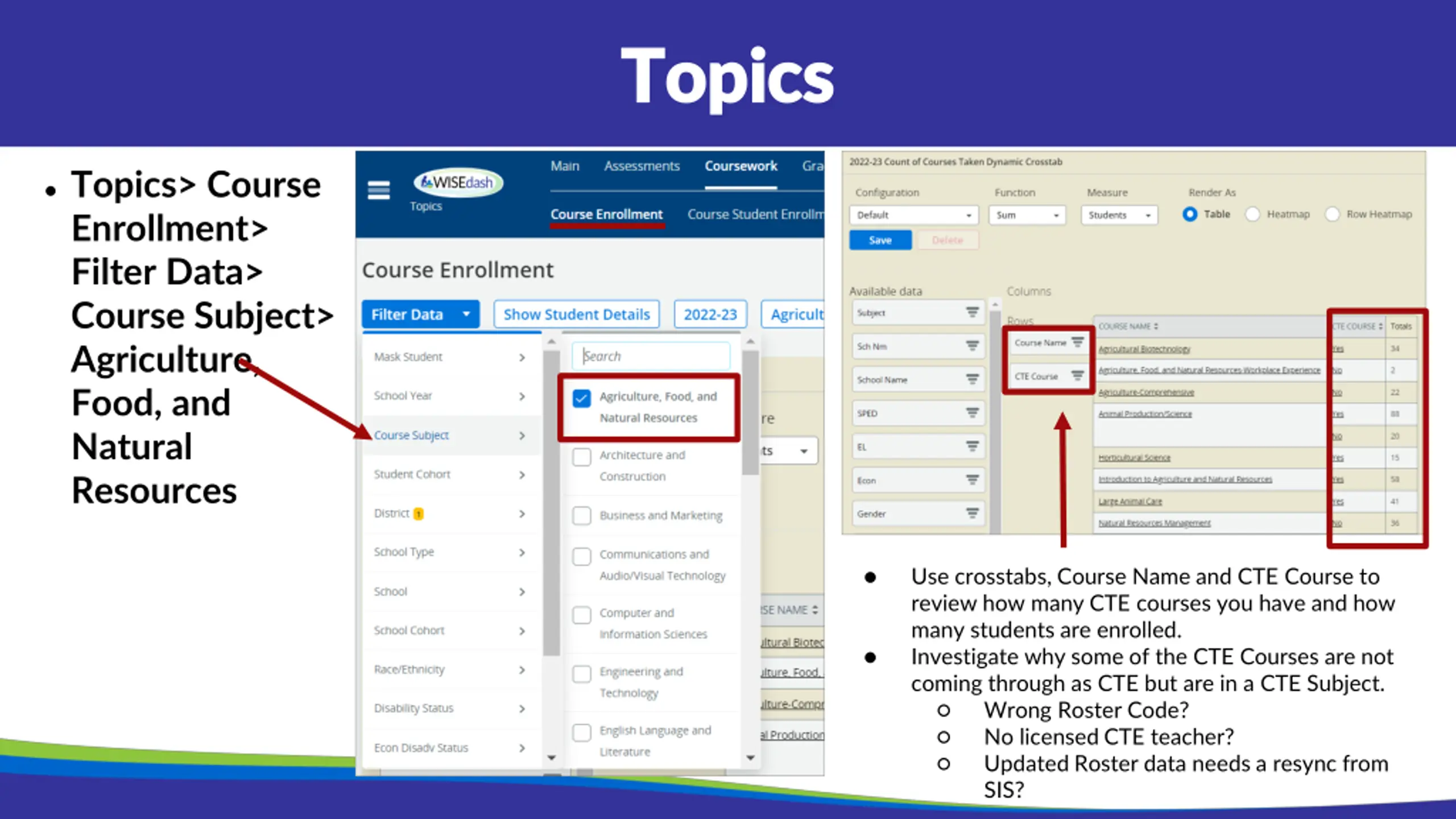 Topics Topics Topics> Course Enrollment> Filter Data> Course Subject> Agriculture, Food, and Natural Resources Use crosstabs, Course Name and CTE Course to review how many CTE courses you have and how many students are enrolled. Investigate why some of the CTE Courses are not coming through as CTE but are in a CTE Subject. Wrong Roster Code? No licensed CTE teacher? Updated Roster data needs a resync from SIS?