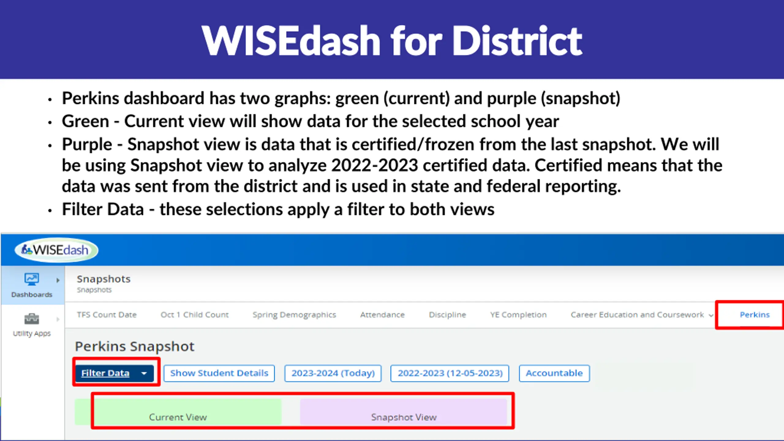 WISEdash for District WISEdash for District Perkins dashboard has two graphs: green (current) and purple (snapshot) Green - Current view will show data for the selected school year Purple - Snapshot view is data that is certified/frozen from the last snapshot. We will be using Snapshot view to analyze 2022-2023 certified data. Certified means that the data was sent from the district and is used in state and federal reporting. Filter Data - these selections apply a filter to both views