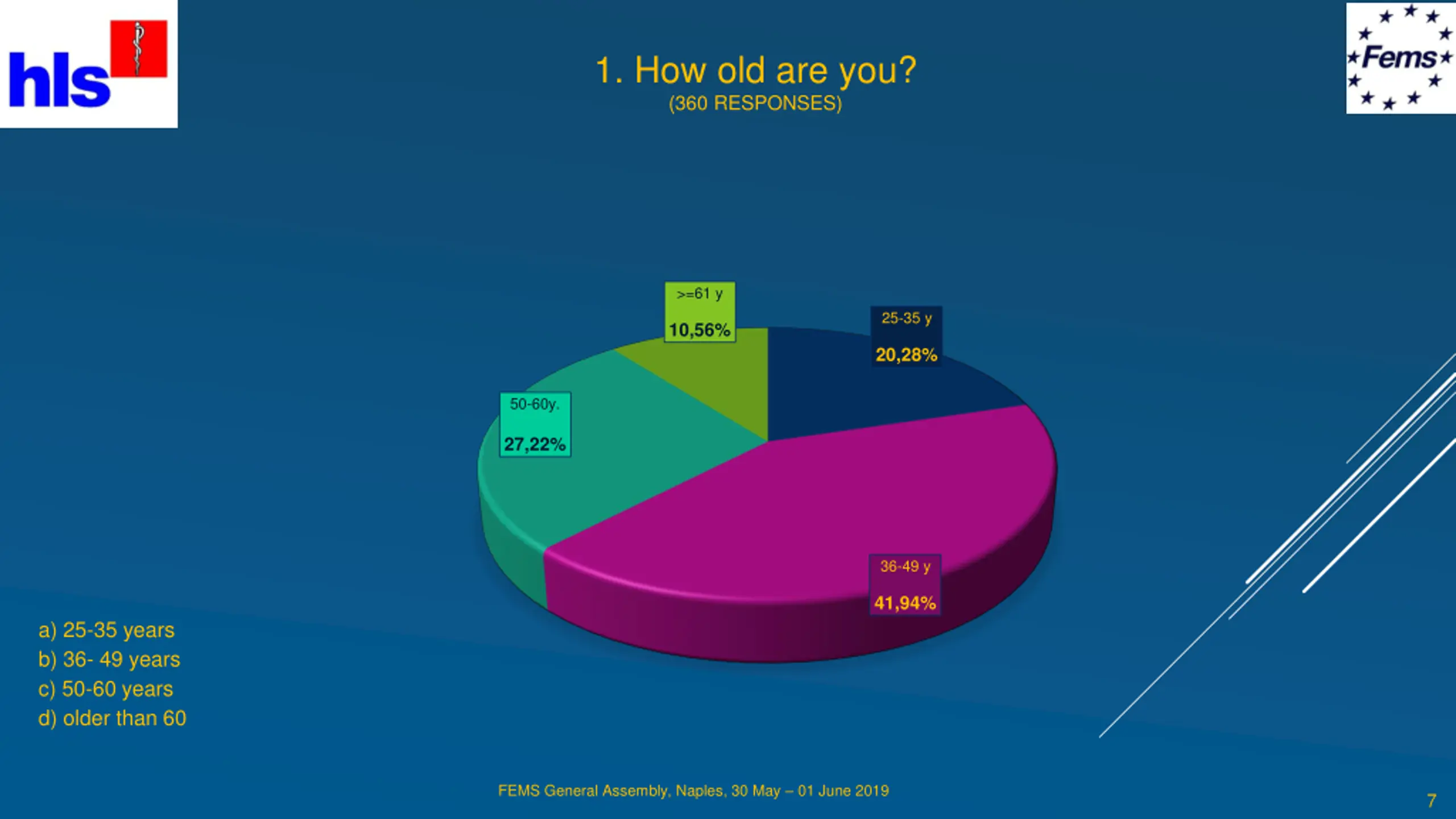 1. How old are you? (360 RESPONSES) >=61 y 25-35 y 10,56% 20,28% 50-60y. 27,22% 36-49 y 41,94% a) 25-35 years b) 36- 49 years c) 50-60 years d) older than 60 FEMS General Assembly, Naples, 30 May 01 June 2019 7