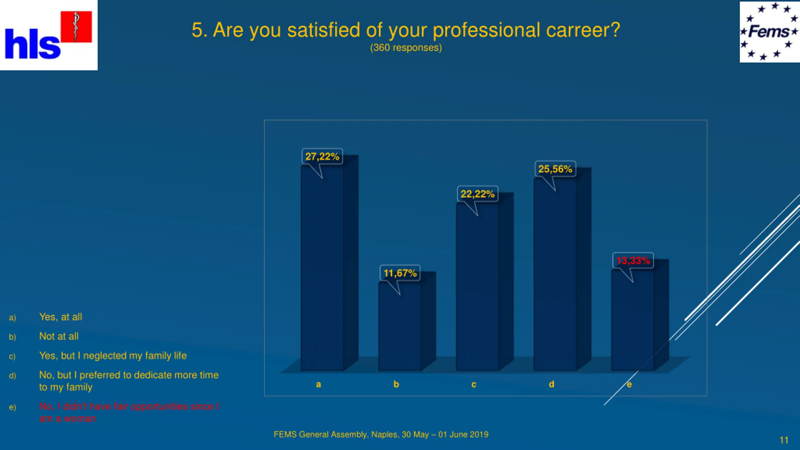 5. Are you satisfied of your professional carreer? (360 responses) 27,22% 25,56% 22,22% 13,33% 11,67% Yes, at all a) Not at all b) Yes, but I neglected my family life c) No, but I preferred to dedicate more time to my family d) a b c d e No, I didn t have fair opportunities since I am a woman e) FEMS General Assembly, Naples, 30 May 01 June 2019 11